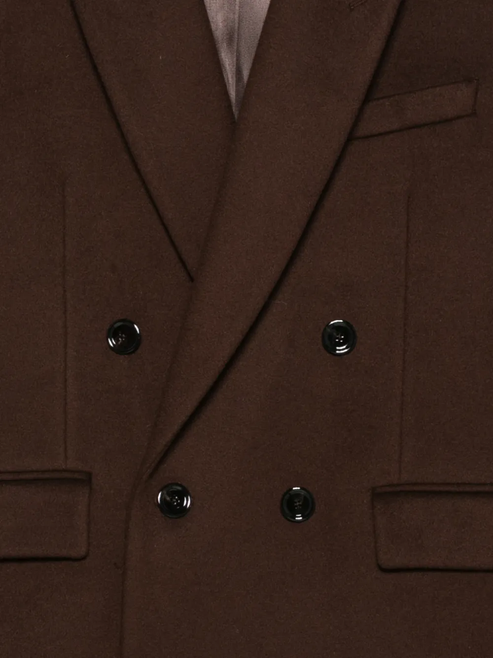 темно-коричневый двубортный пиджак с застежкой на пуговицы, лацканами с вырезом, клапанами на карманах и манжетами на пуговицах