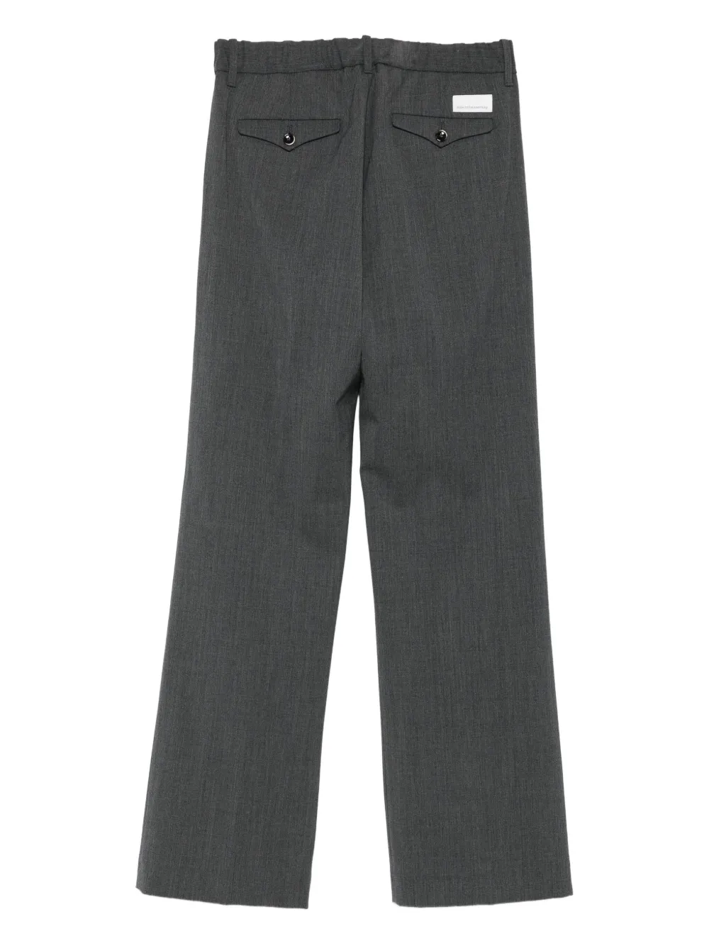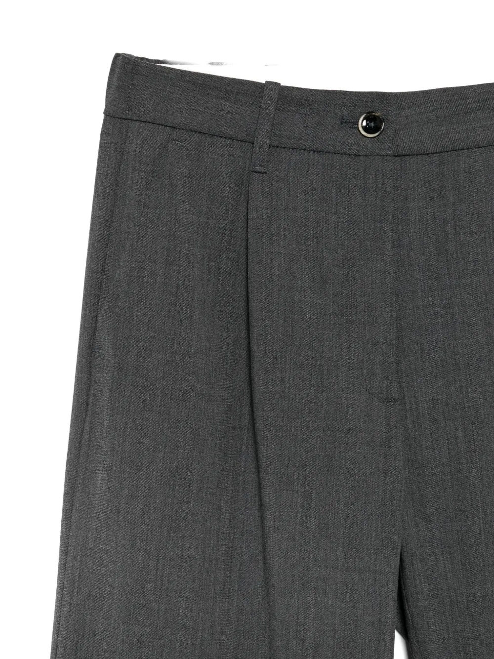 серые плиссированные брюки с застёжкой на пуговицы, шлёвками для ремня и задним прорезным карманом