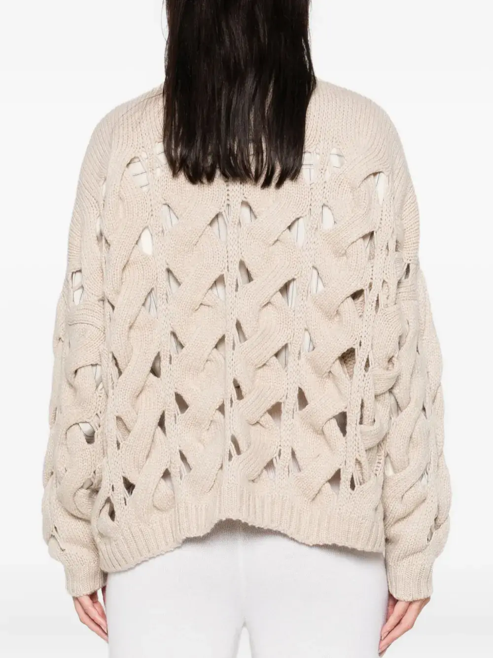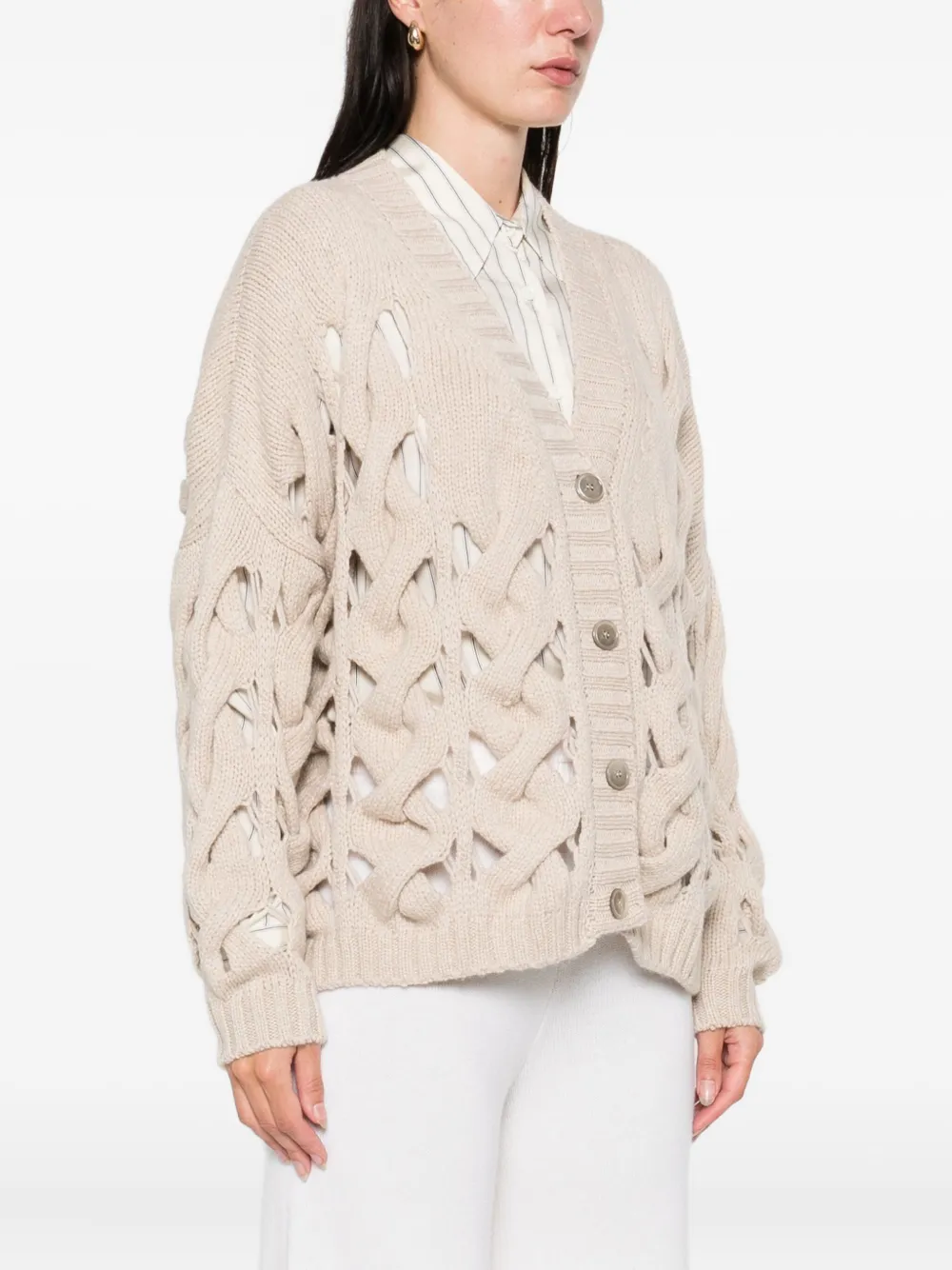 бежевый кардиган с ажурной вязкой, застёжкой на пуговицы и V-образным вырезом
