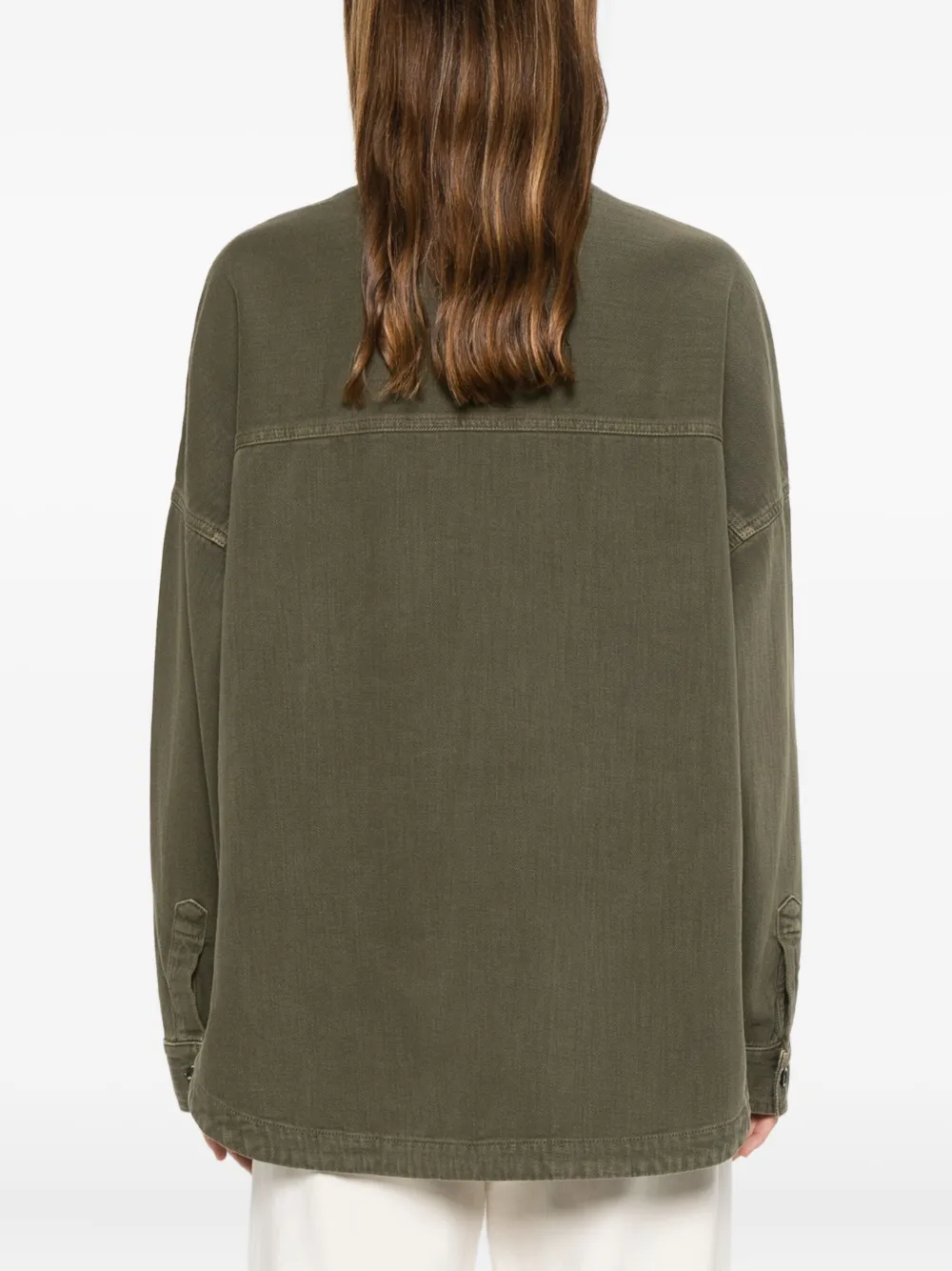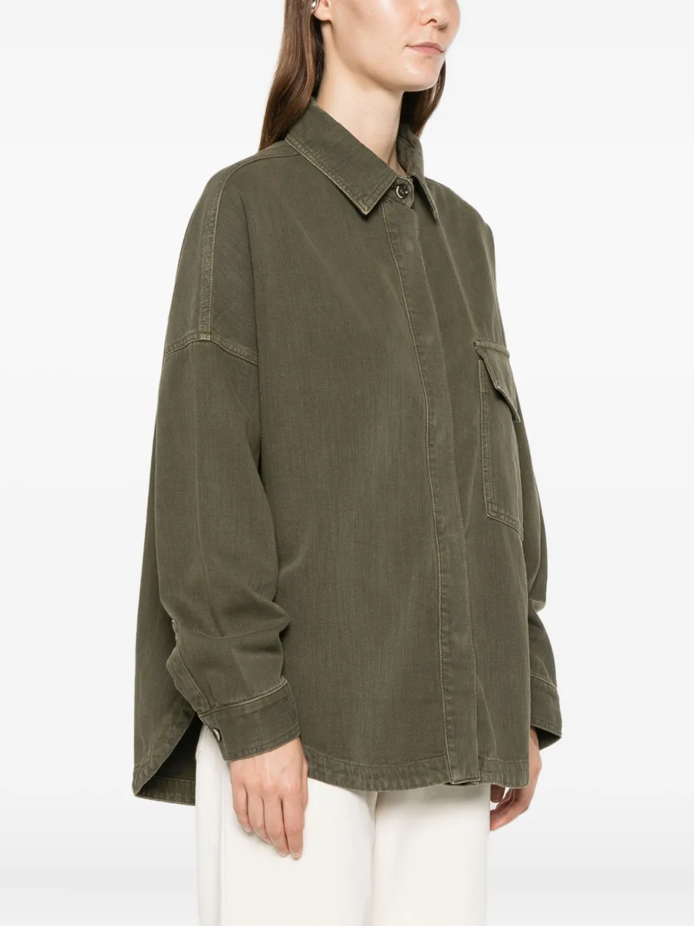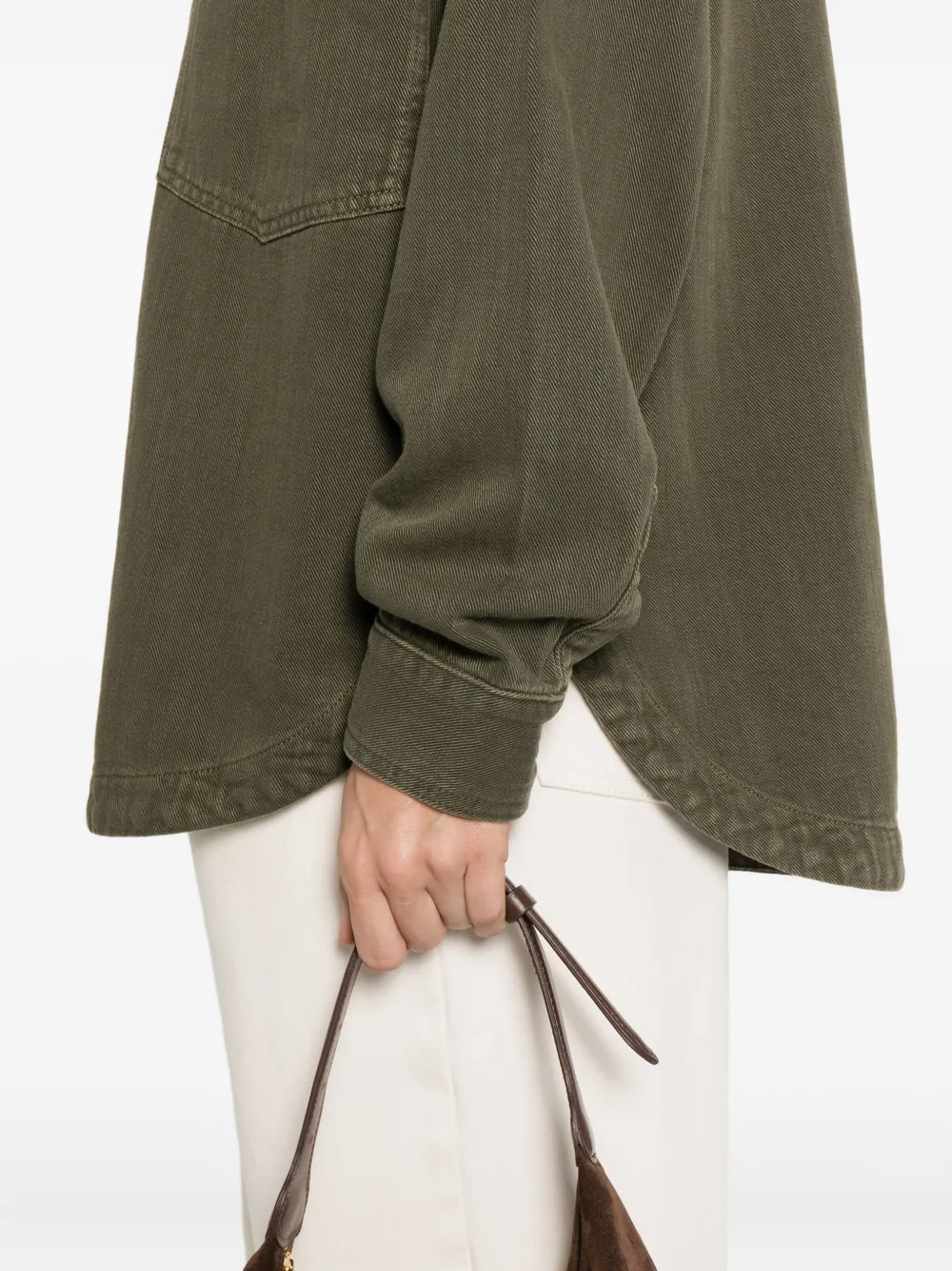 оливково-зеленая хлопковая рубашка с нагрудным карманом, застежкой на пуговицы, закругленным подолом и длинными рукавами
