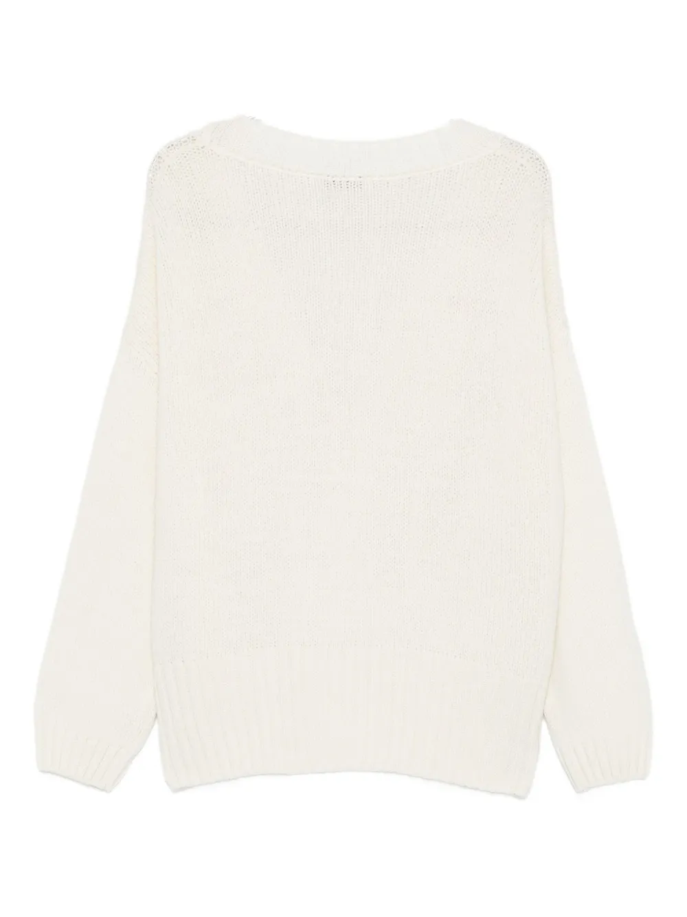 молочно-белый, V-образный вырез, застёжка на пуговицы спереди, длинные рукава, два накладных кармана спереди, ребристый край
