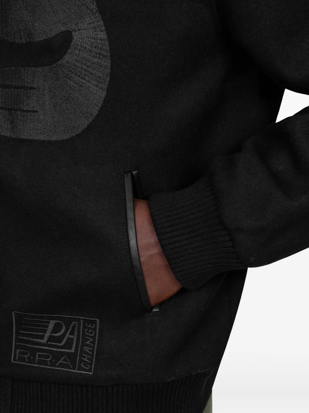 черный с графическим принтом, ребристый низ, боковой прорезной карман, застежка на пуговицы спереди, длинные рукава