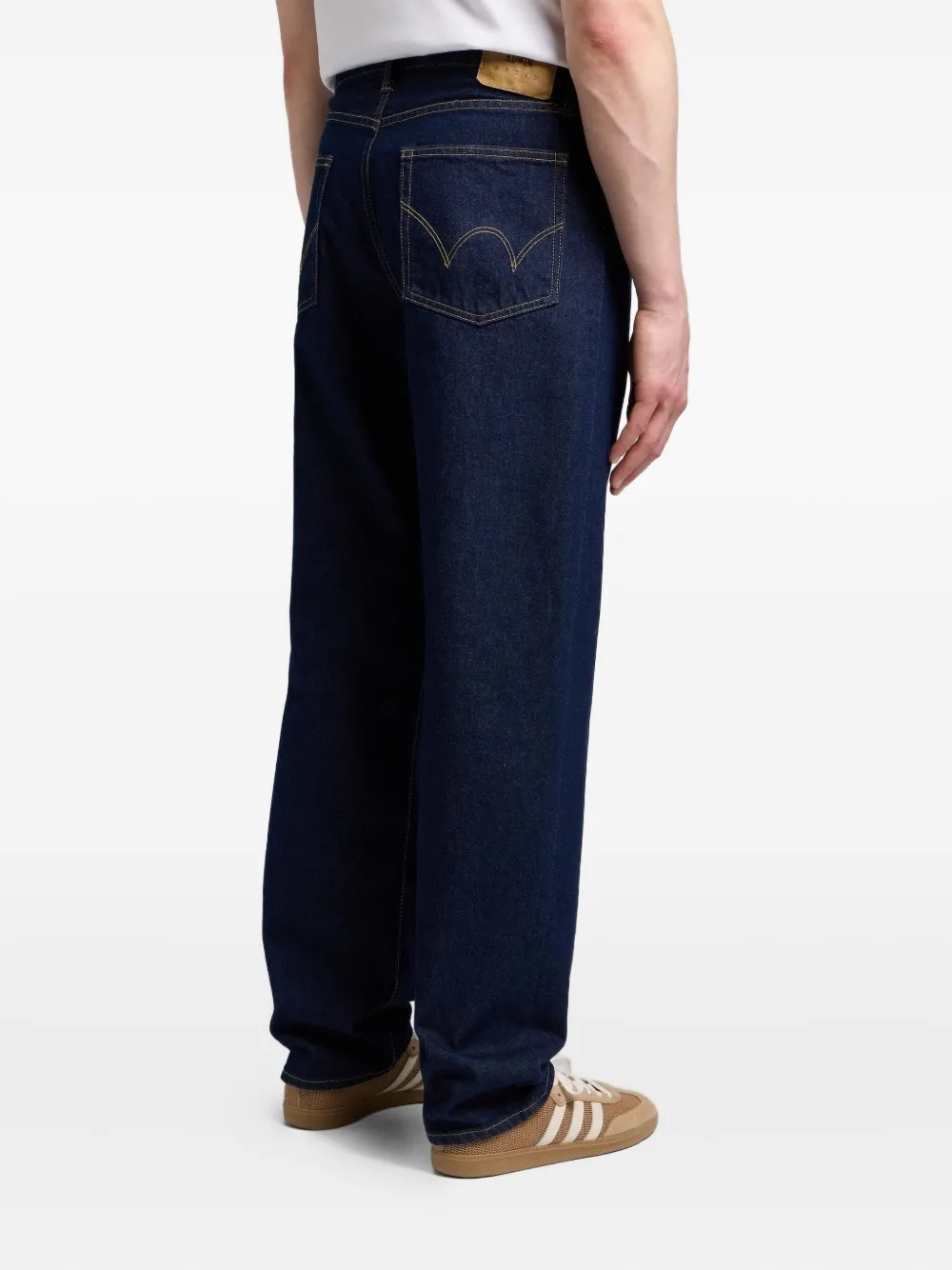 полуобработанный синий хлопок, застежка-молния, пять карманов, нашивка с логотипом сзади