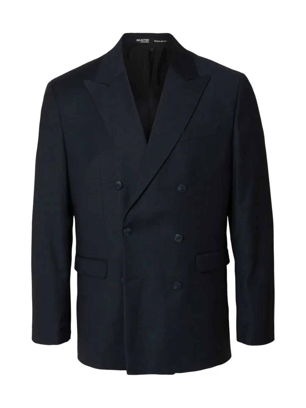 темно-синий пиджак в клетку, двубортная застежка на пуговицы, лацканы с вырезом, прорезные карманы с клапанами, длинные рукава