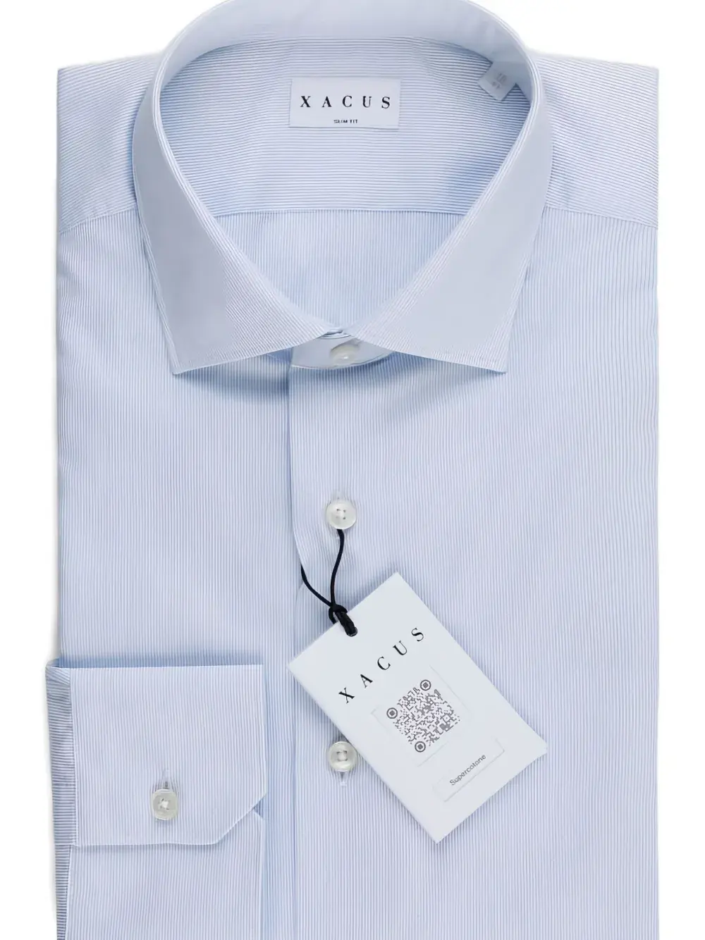 светло-голубая рубашка в полоску, застёжка на пуговицы, длинные рукава, манжеты на пуговицах, заострённый воротник