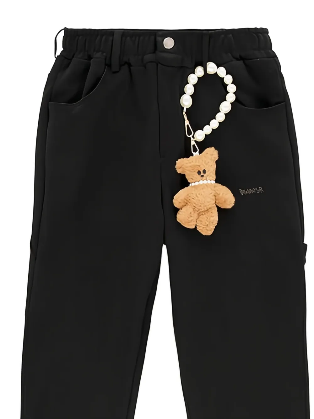 черный брелок-медвежонок, жемчужные детали, эластичный пояс, боковые карманы, эластичные манжеты