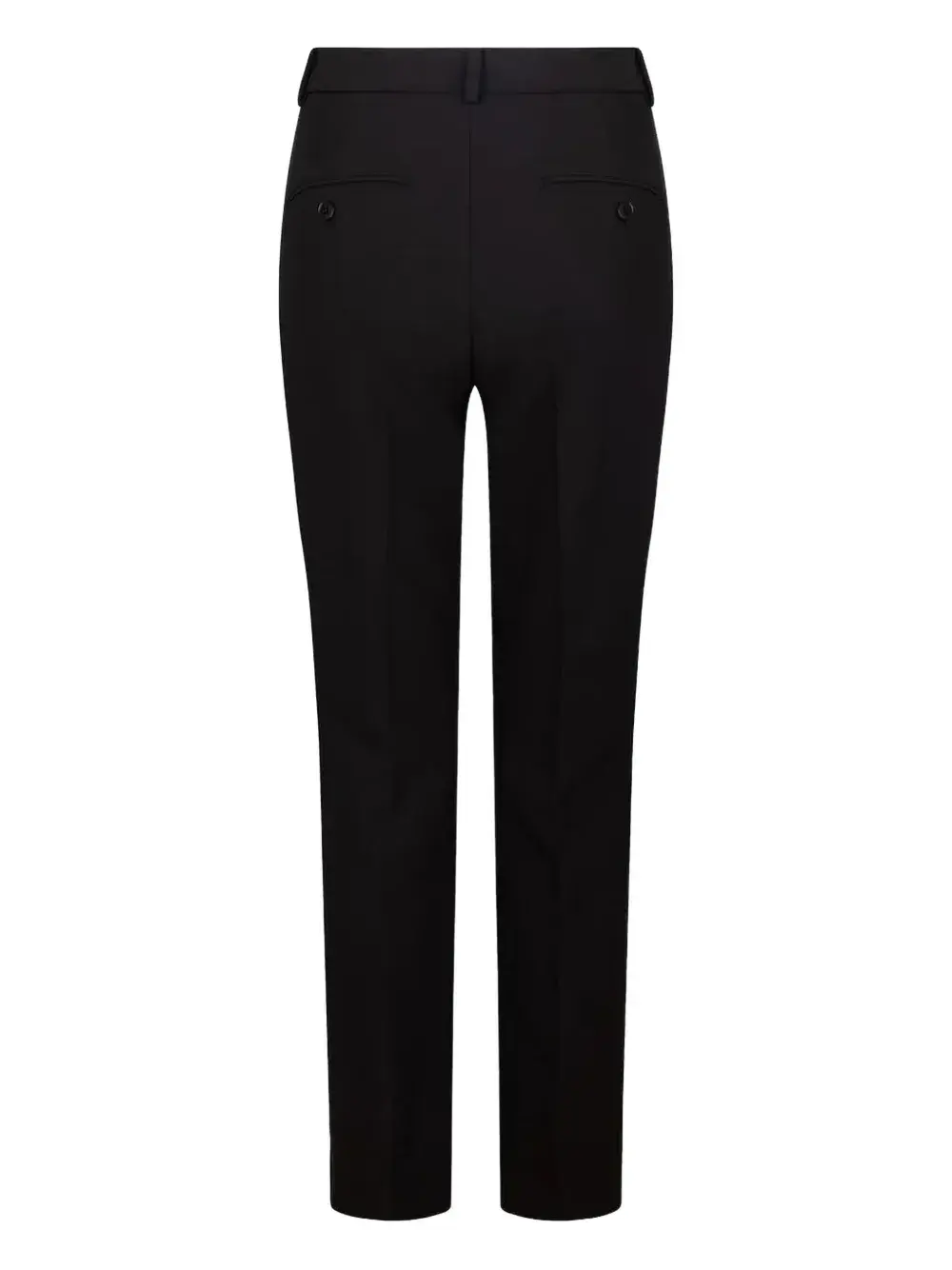 чёрные, скрытая застёжка спереди, шлёвки для ремня, два боковых кармана, задние прорезные карманы