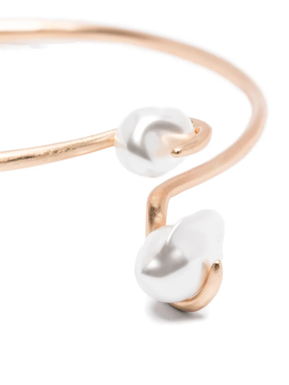 Браслет-кафф золотистого оттенка с искусственным жемчугом. Изделие поставляется в комплекте с защитным мешочком для хранения.