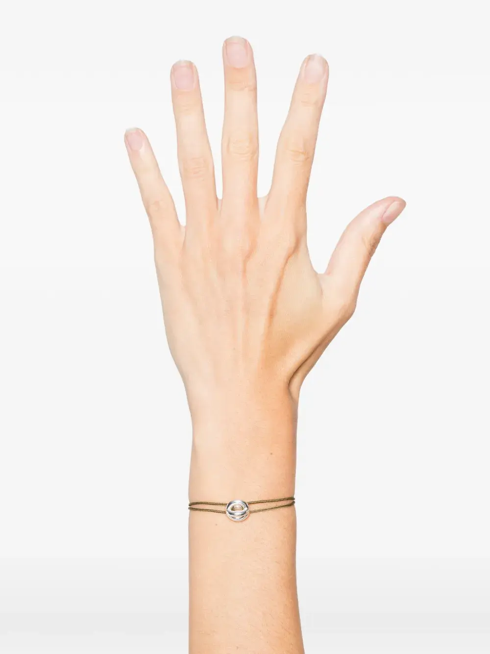 Серебристый фиксатор с деталью из хаки-шнура, регулируемая застёжка