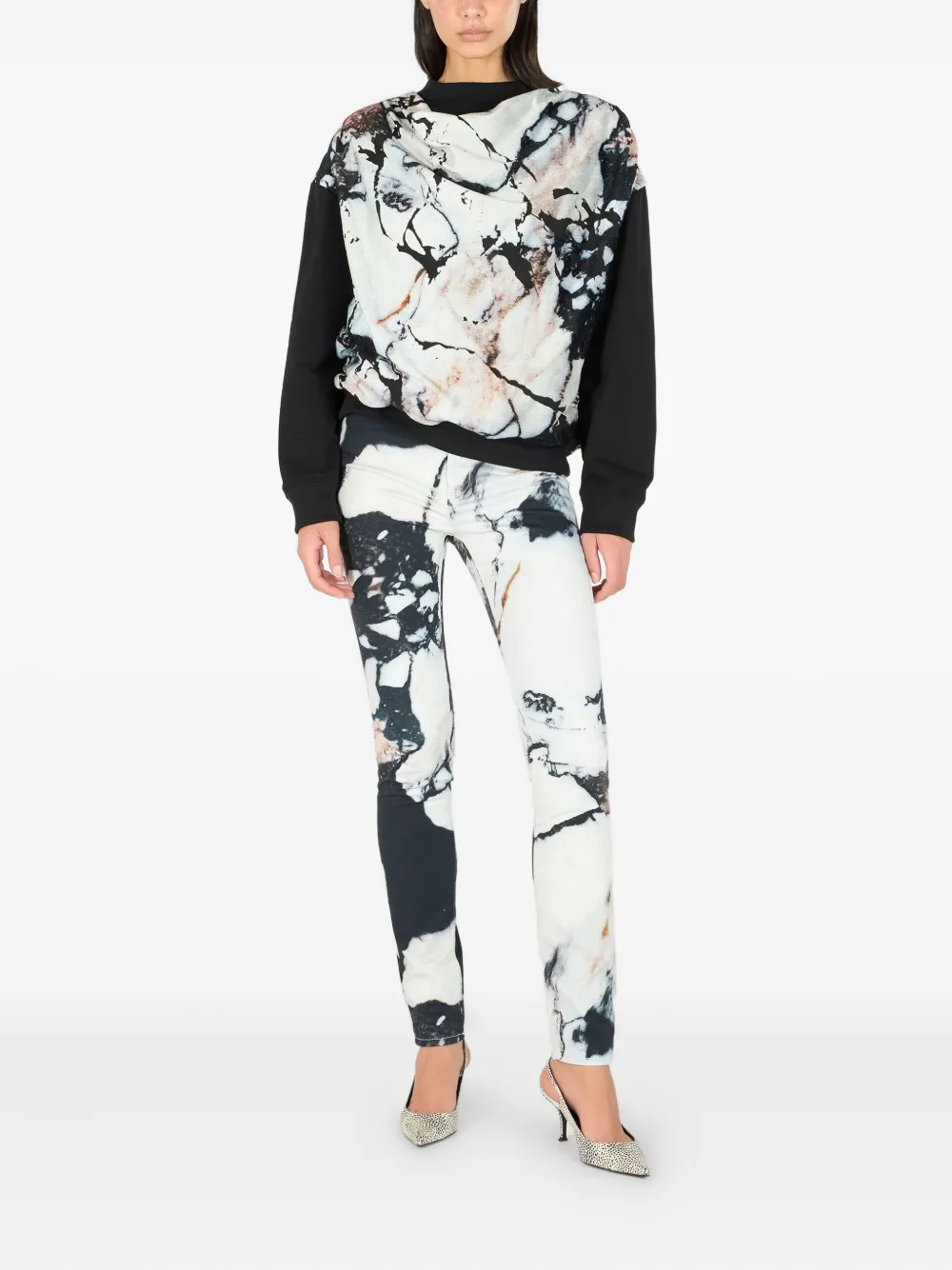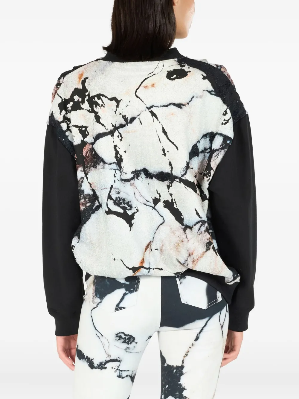 черный с мраморным принтом, круглый вырез, длинные рукава, ребристый низ, ребристые манжеты