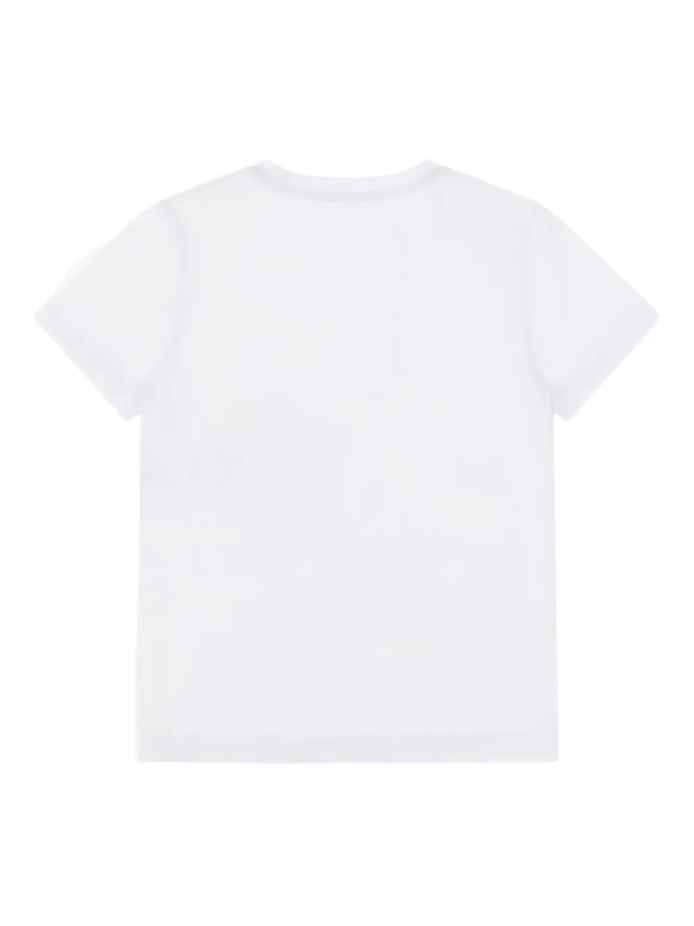 белая футболка с графичным принтом, круглым вырезом и короткими рукавами