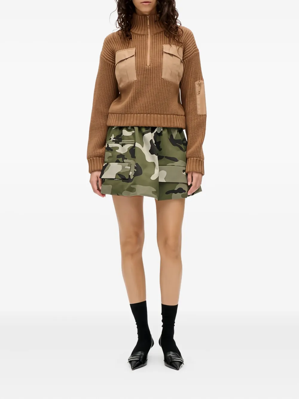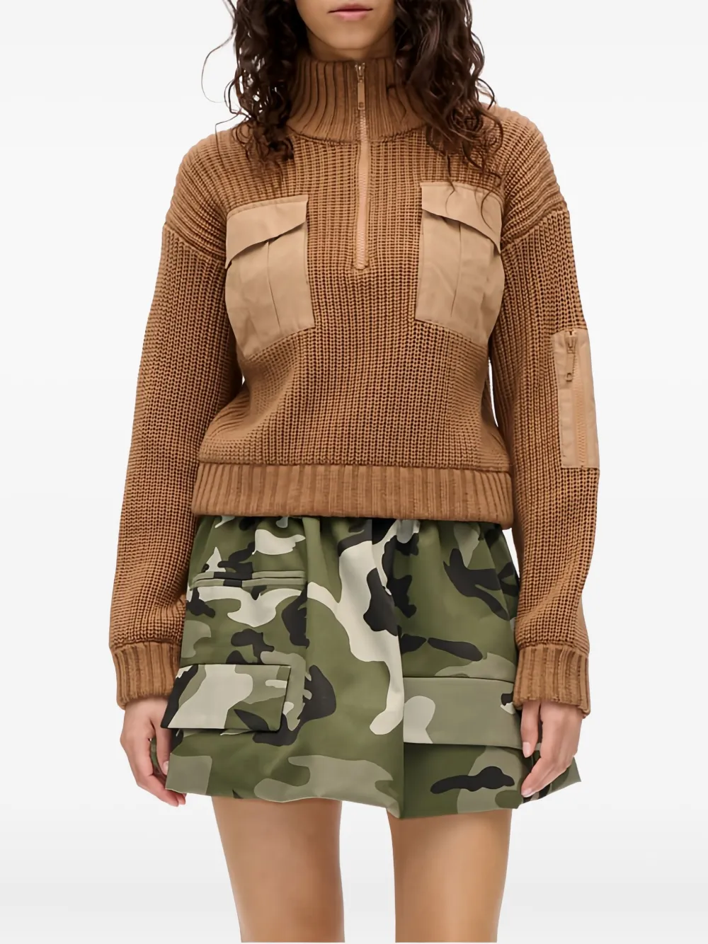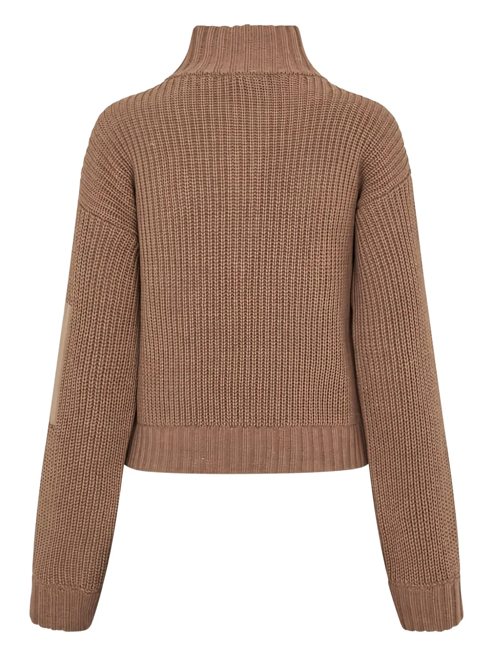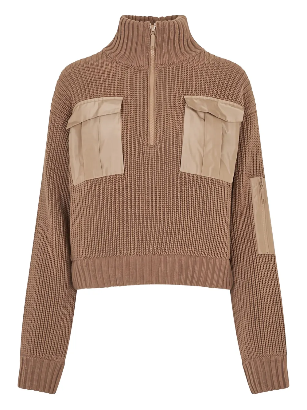 коричневый, смесь мериноса, ребристые отделки, высокий воротник, застёжка на половину молнии, накладные карманы на груди, карман на рукаве на молнии