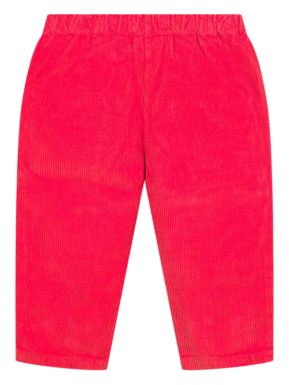 красный вельвет, текстурированный, эластичный пояс, два накладных задних кармана, вышивка поезда, хлопок