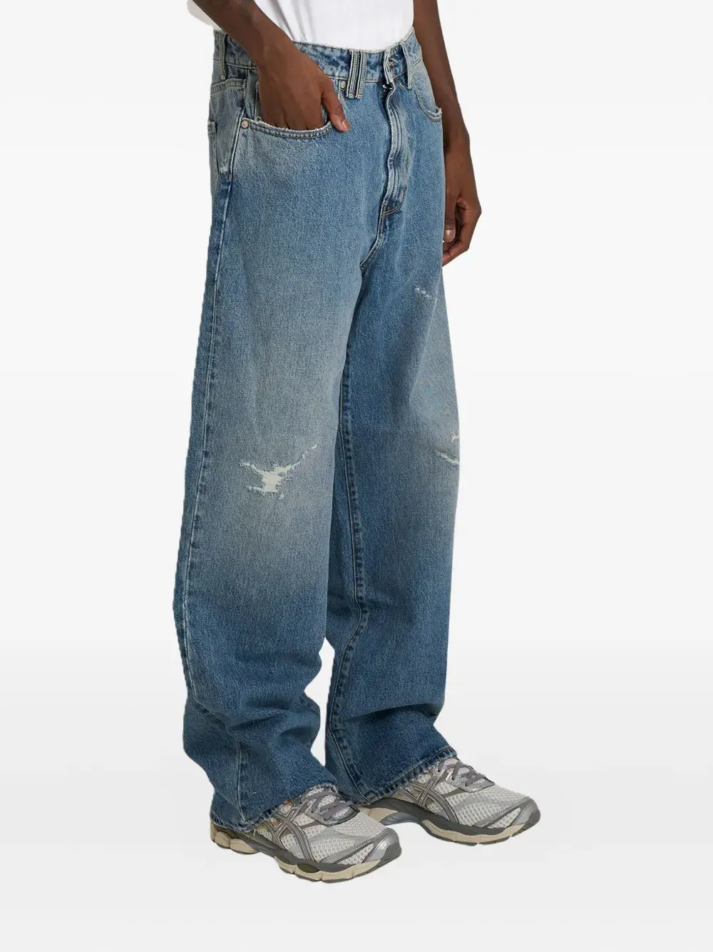 синий цвет, эффект состаренности, шлевки для ремня, пять карманов, логотип на задней стороне, потертости на задней стороне