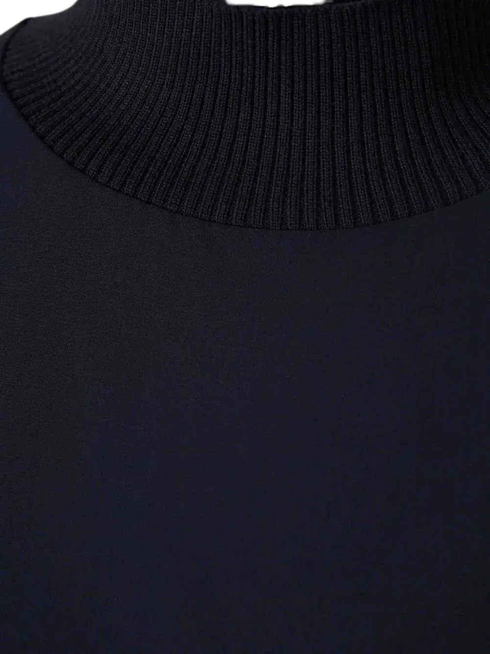 синий свитер с круглым вырезом, манжетами на пуговицах и длинными рукавами