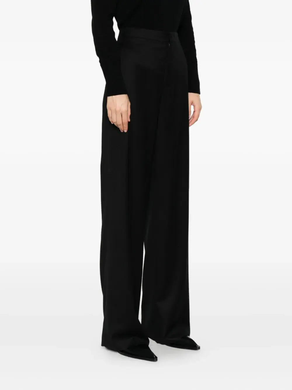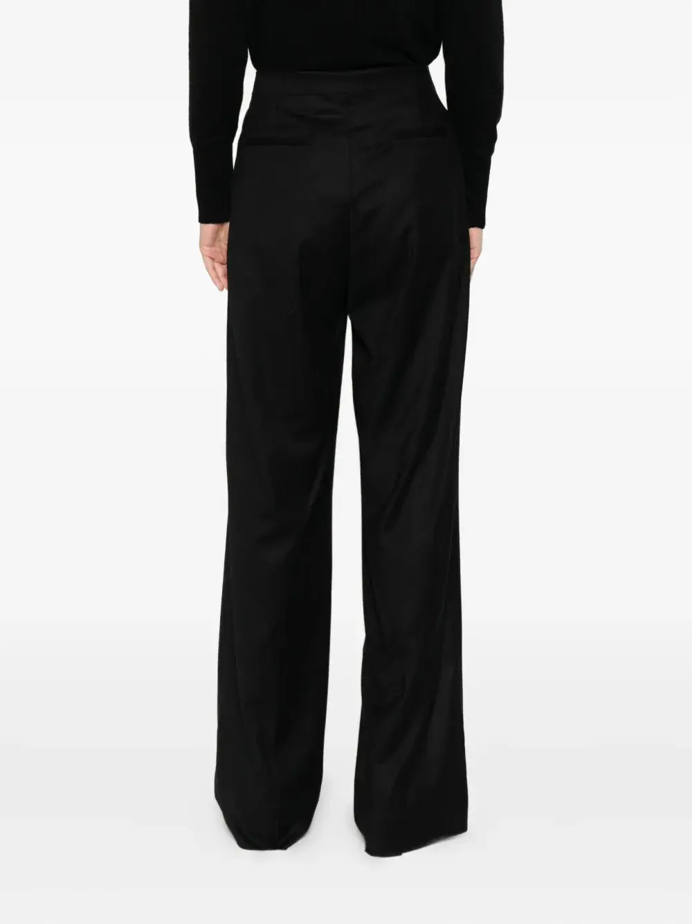 черные шлевки для ремня, скрытая застежка, боковые карманы в шве, задние прорезные карманы, прямые брючины