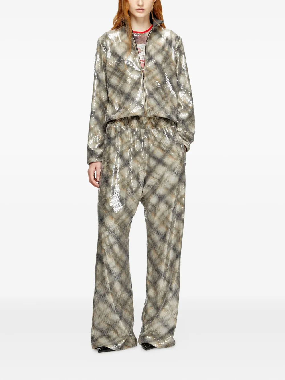 бежево-серый клетчатый узор, декоративные элементы, застёжка-молния, высокий воротник