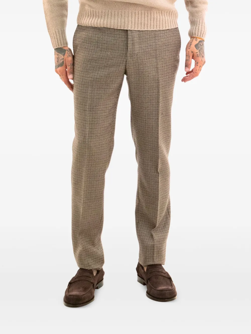 коричневые шерстяные брюки с узором "гусиная лапка", шлёвки для ремня, манжеты по низу, застёжка на пуговицу, защипы спереди
