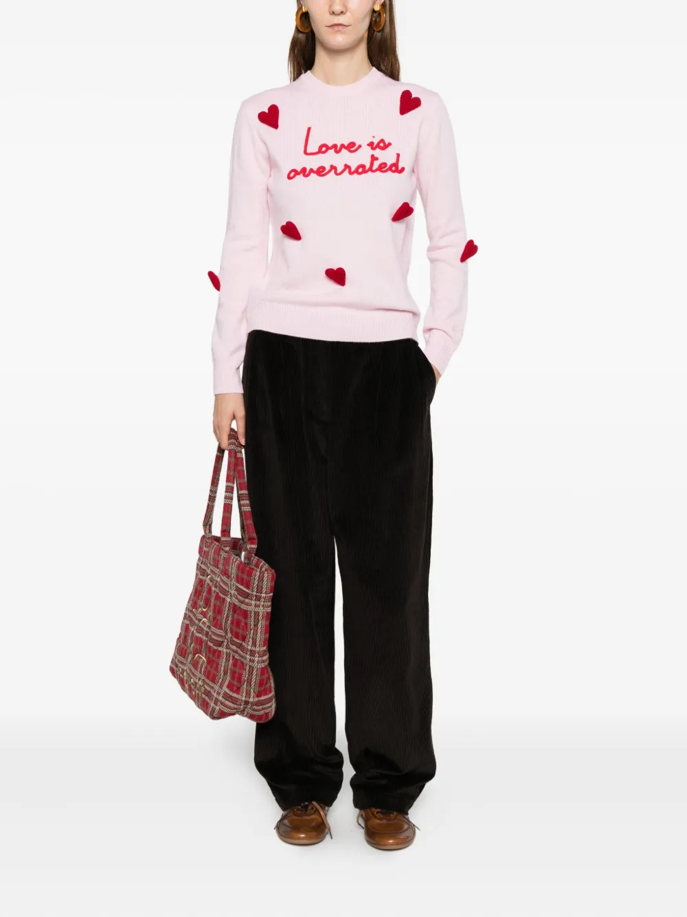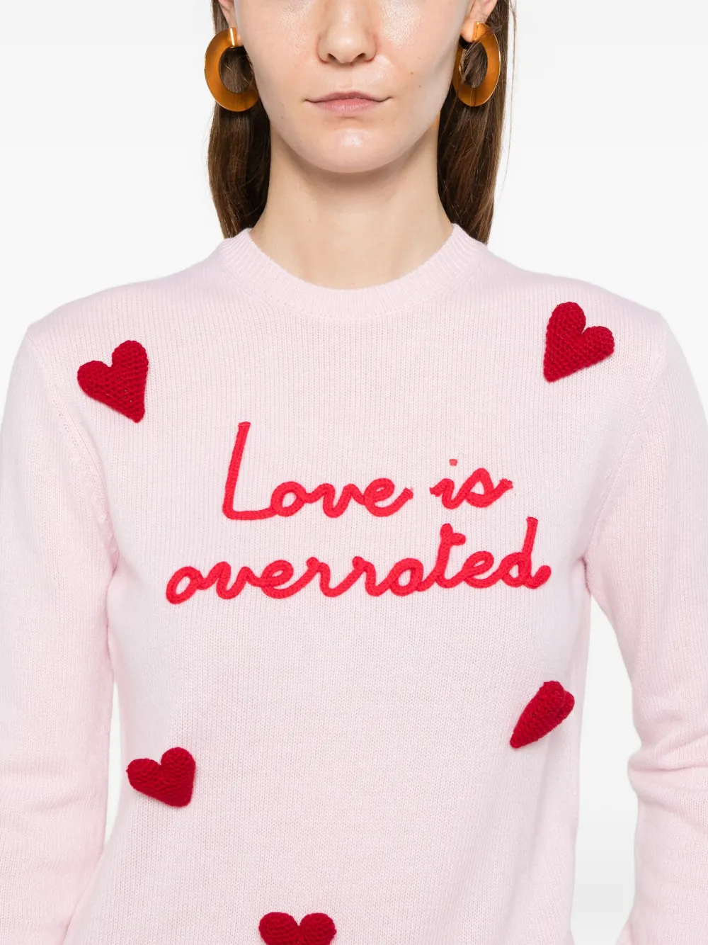 розовый свитер с вышитым сердечком, круглым вырезом, длинными рукавами и трикотажной резинкой
