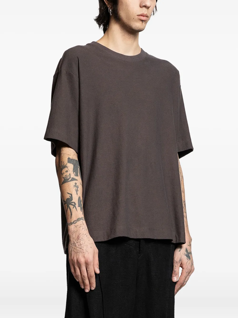 темно-коричневая футболка с принтом на спине, круглым вырезом и короткими рукавами