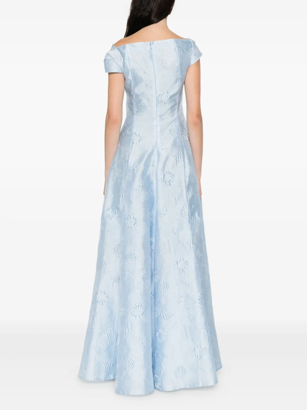 небесно-голубой цветочный узор, вырез-качели, короткие рукава, скрытая молния сзади, длина в пол