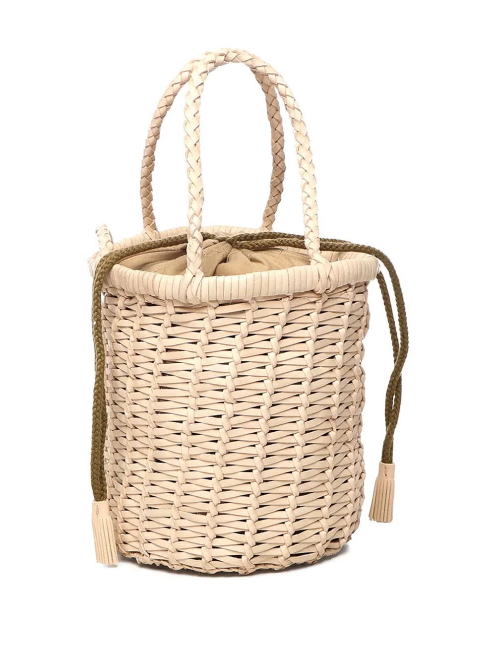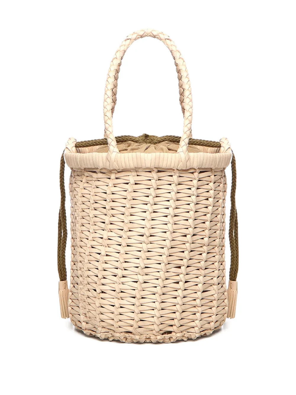 светло-бежевые плетёные верхние ручки, застёжка на кулиску, плетёный дизайн, отделка кисточками