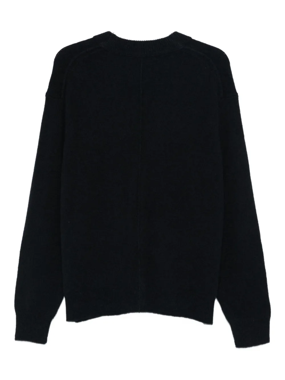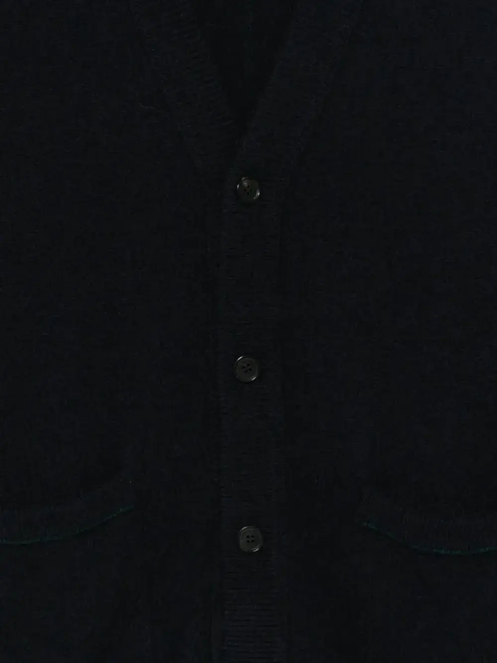темно-синий V-образный вырез, застежка на пуговицы спереди, два накладных кармана спереди, длинные рукава, ребристый низ