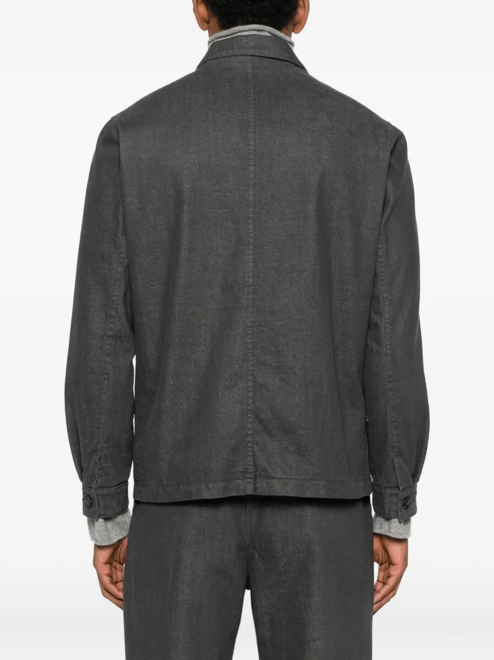 свинцово-серый, застёжка на пуговицы, накладные карманы, длинные рукава, отложной воротник, хлопок