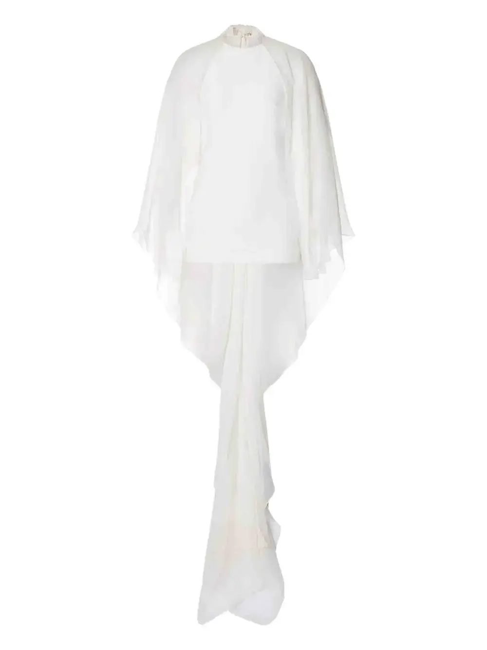 белое платье с высоким воротом, драпировкой, застежкой-молнией сзади, длинным шлейфом и прозрачной отделкой