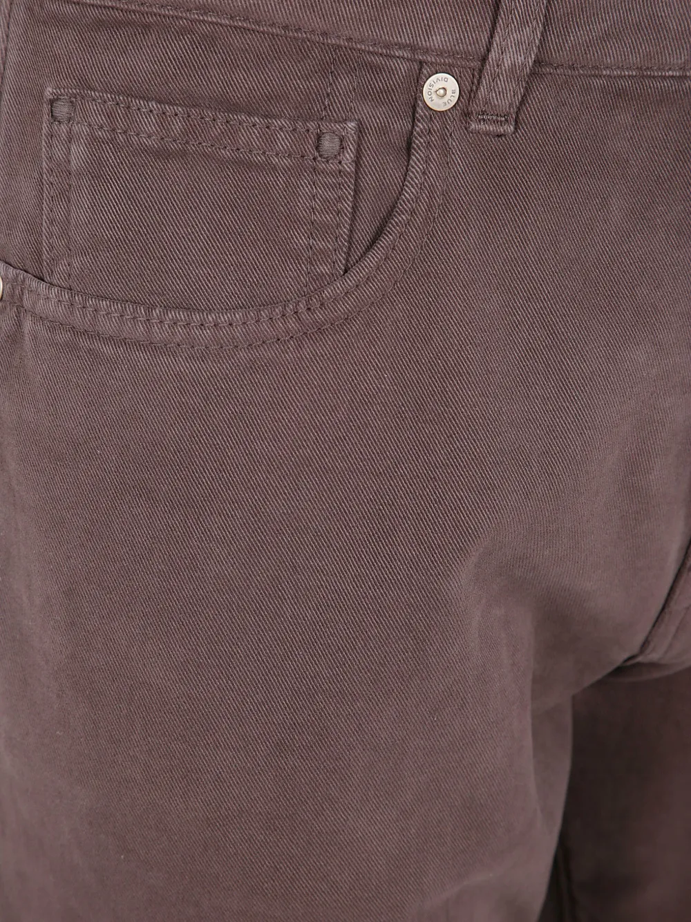 коричневый хлопковый материал, шлевки для ремня, классические пять карманов, отделка строчкой, застежка на пуговицу спереди
