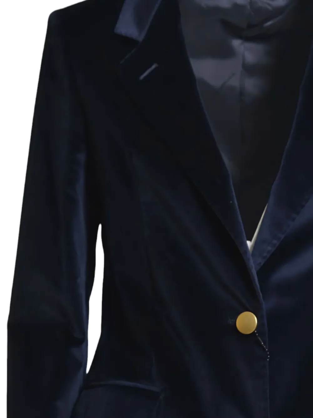 синий бархат, текстура, застежка на пуговицы, лацканы с вырезом, передние прорезные карманы с клапанами, длинные рукава