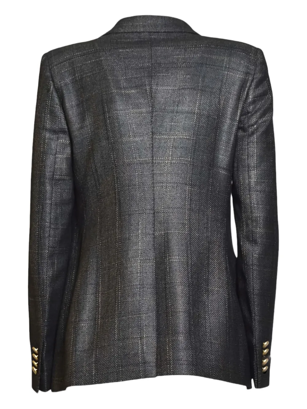 серый пиджак в клетку, двубортный, с позолоченными пуговицами, лацканами с вырезом и прорезными карманами с клапанами