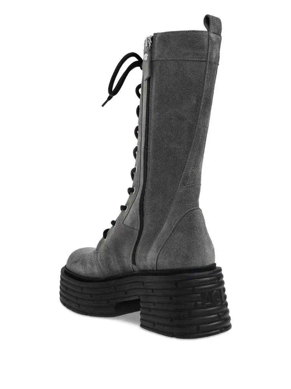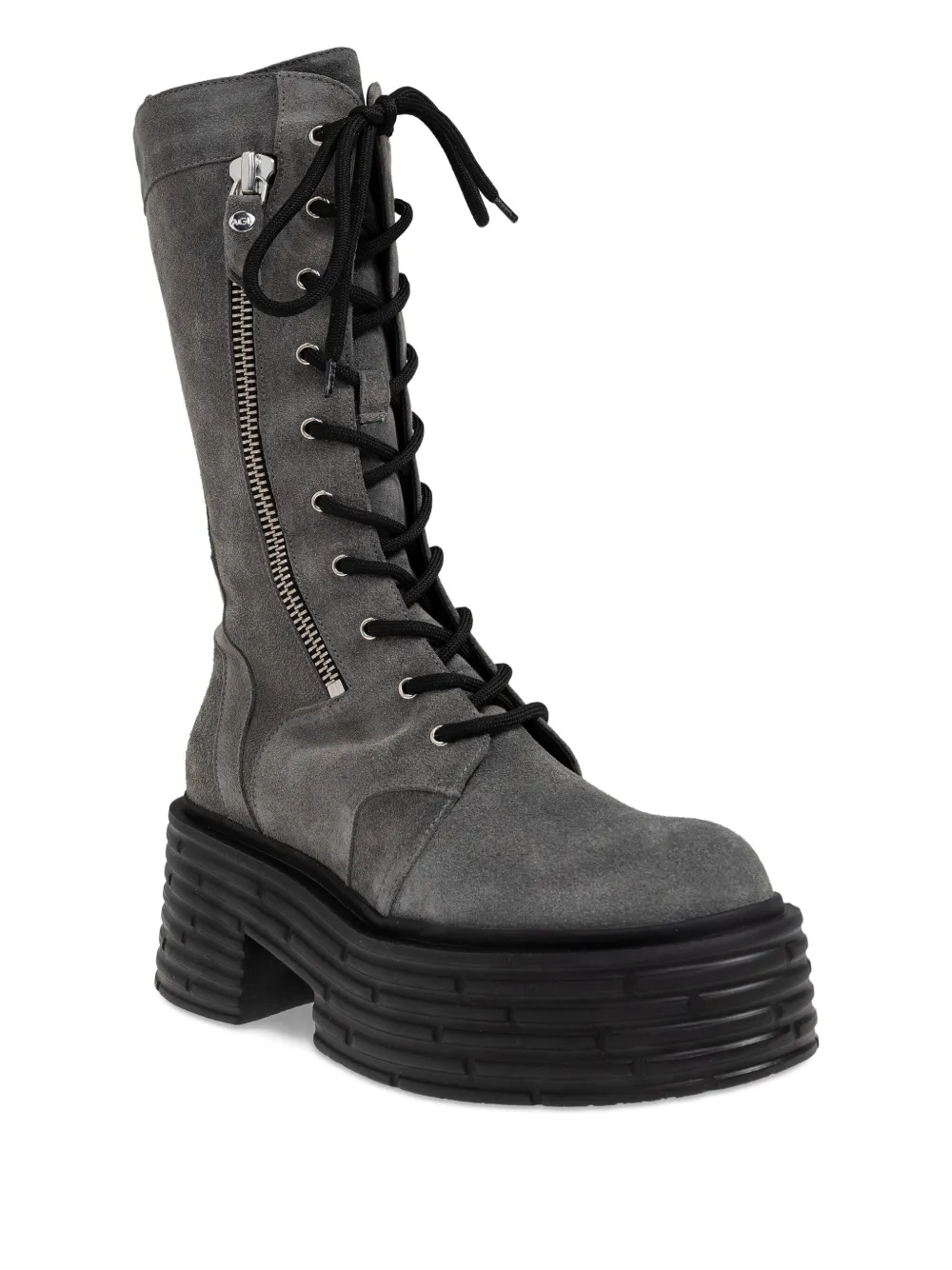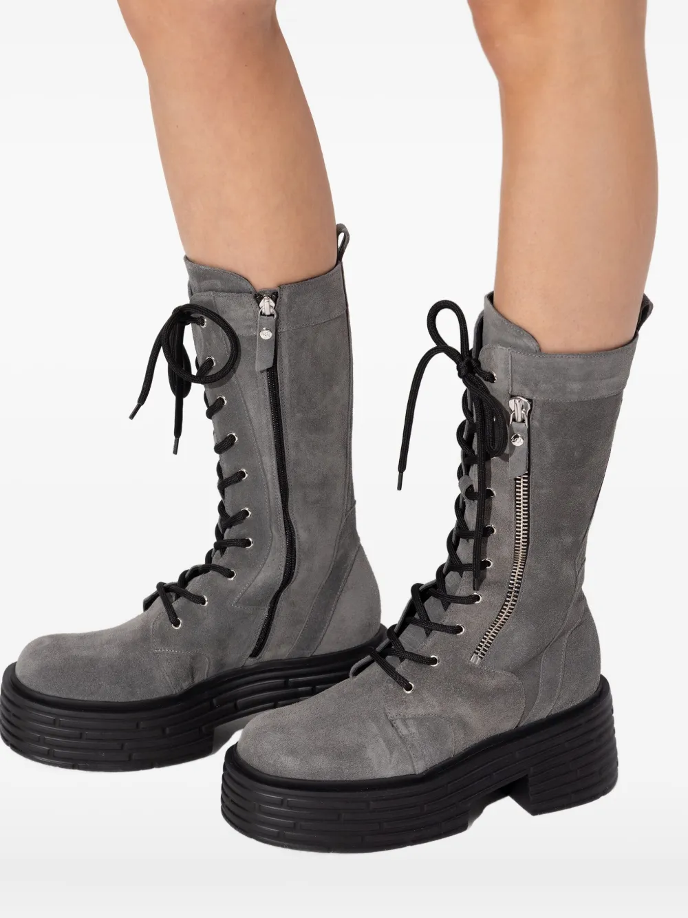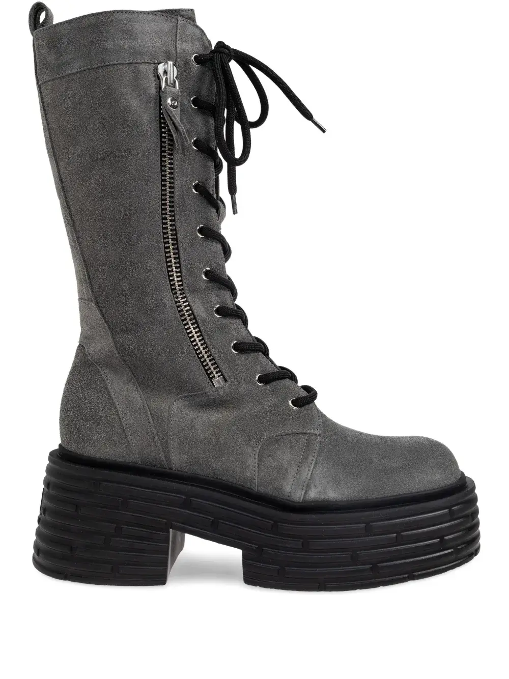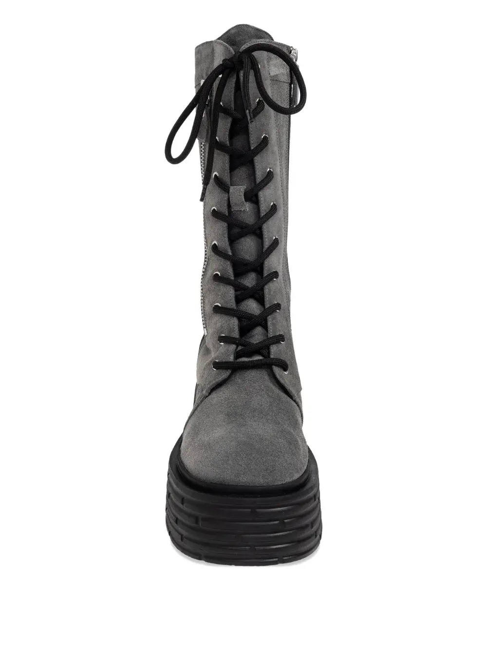 верх из серой телячьей замши, застежка-молния сбоку, шнуровка, рифленая подошва, каблук квадратной формы