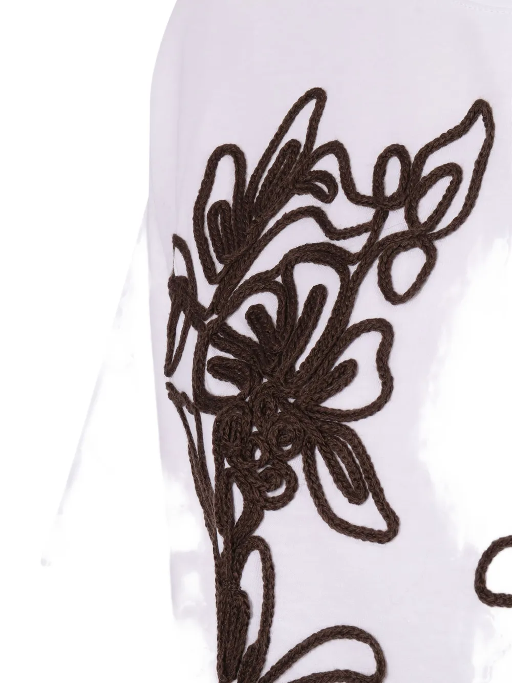 белая футболка с цветочной вышивкой, круглым вырезом и короткими рукавами
