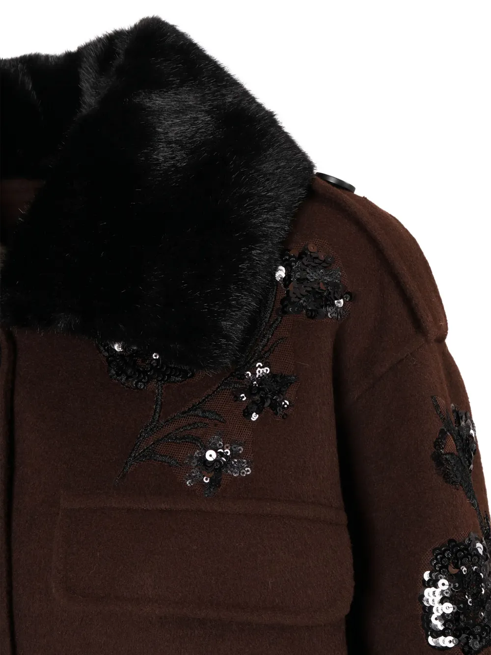 коричневый меховой воротник, украшение пайетками, застёжка на пуговицы, накладные карманы с клапанами, наплечные погоны