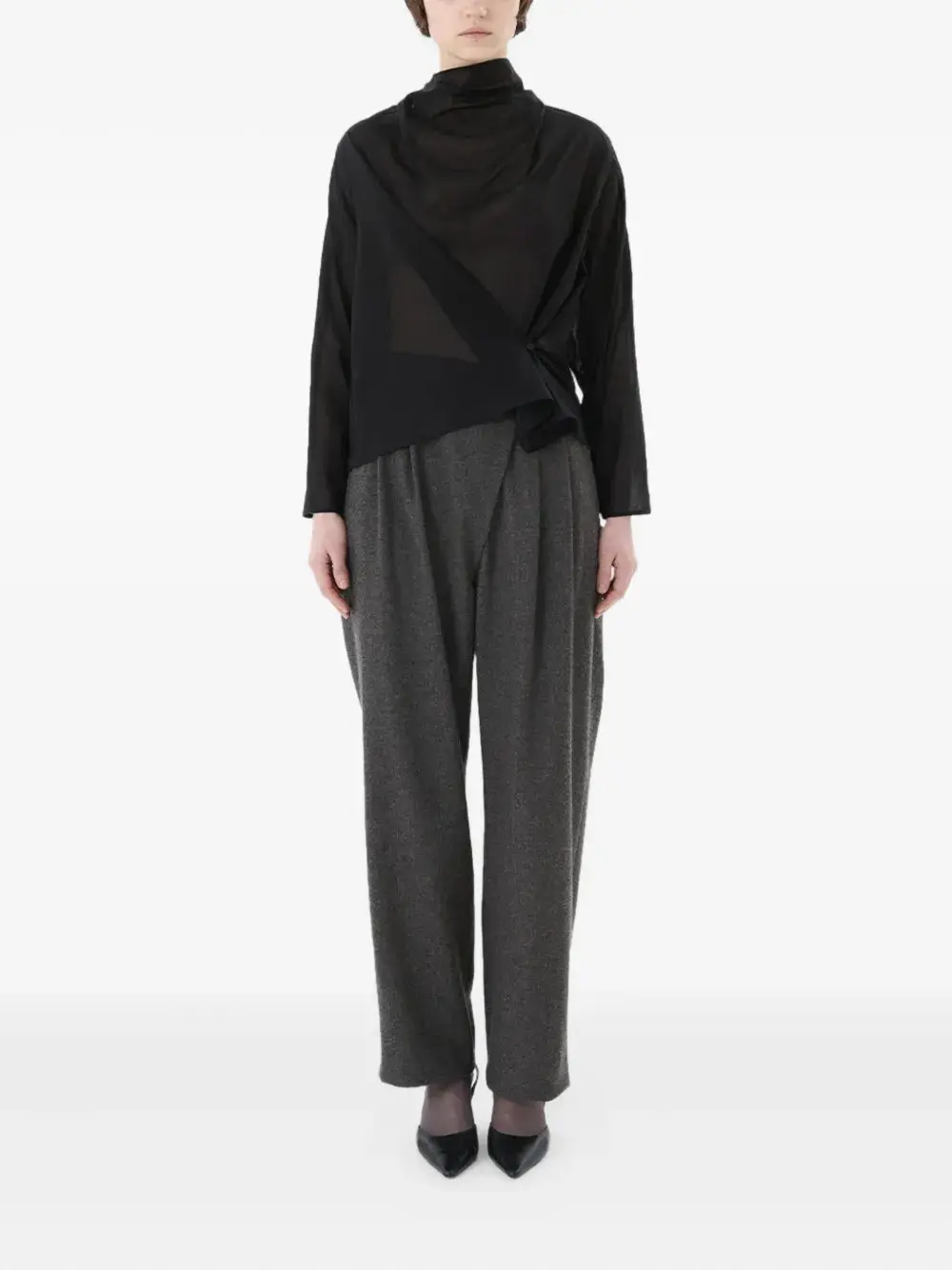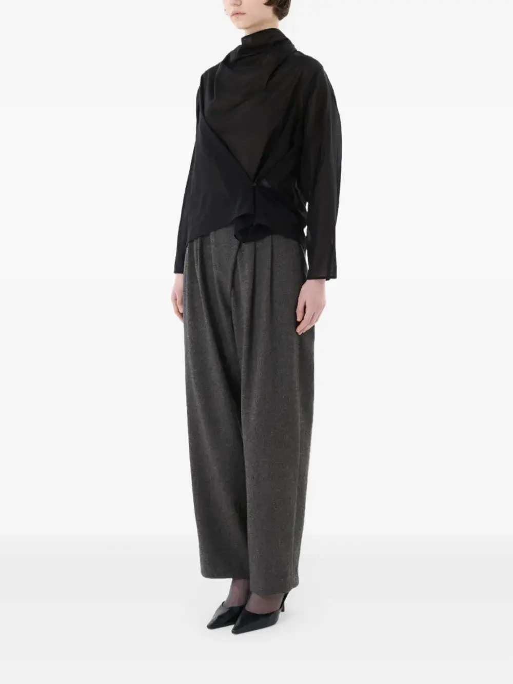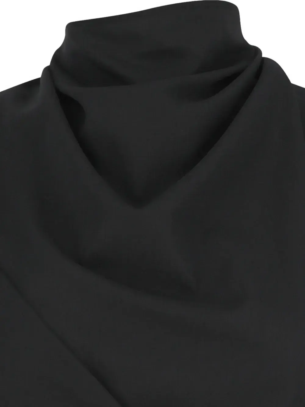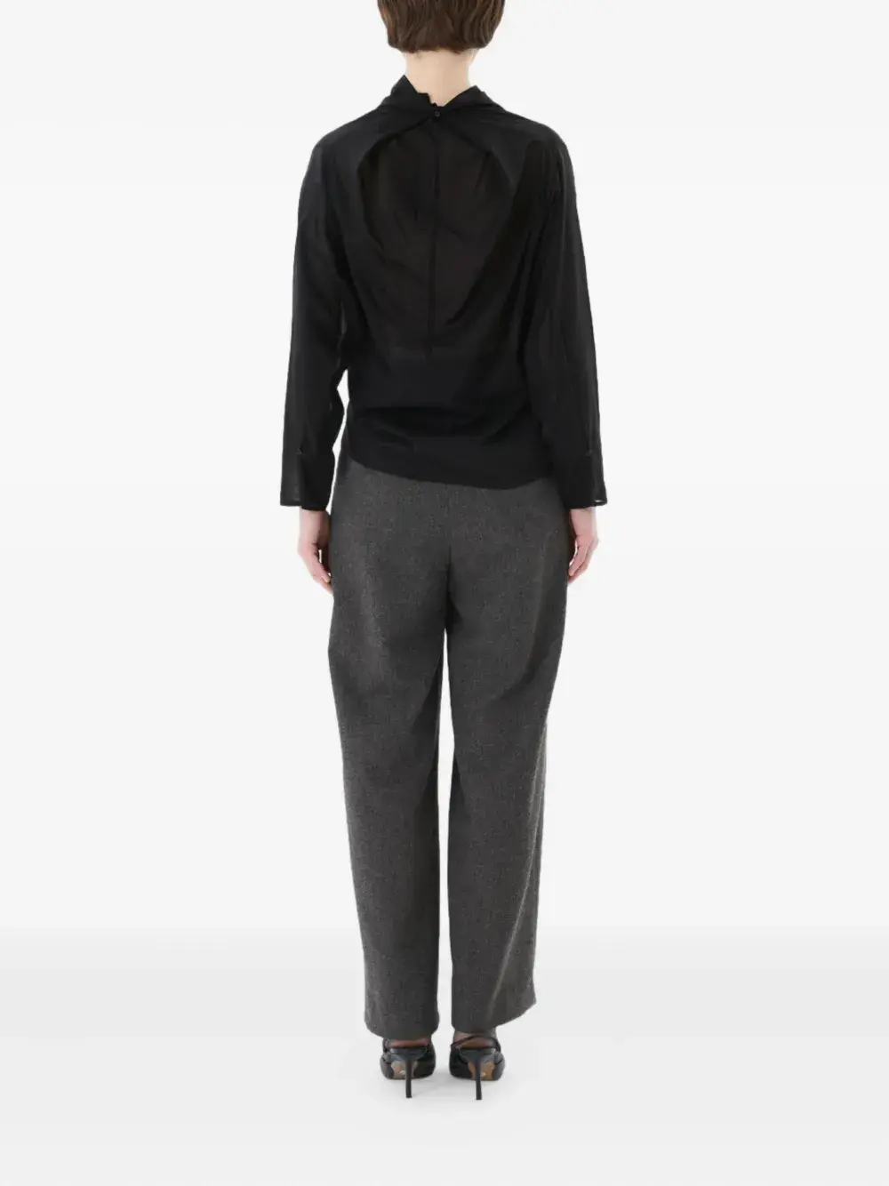 черная блуза с пуговицами, длинными рукавами, открытой спиной и драпировкой