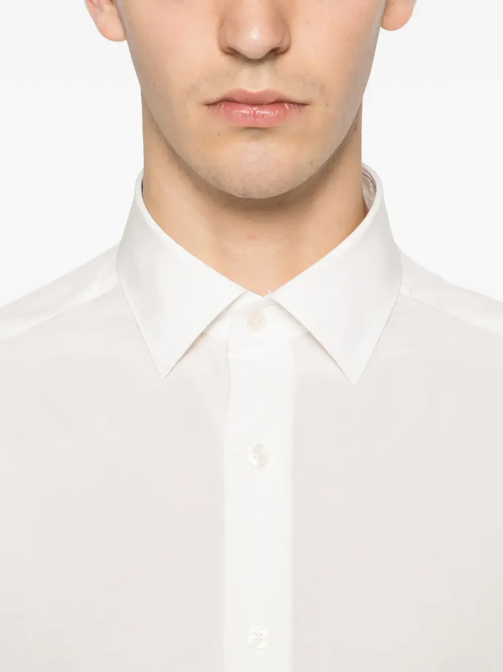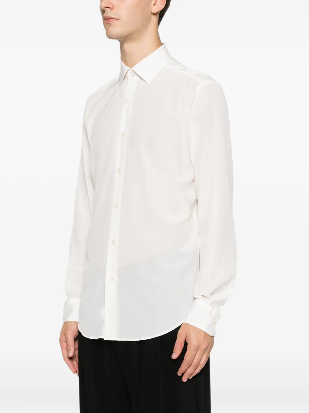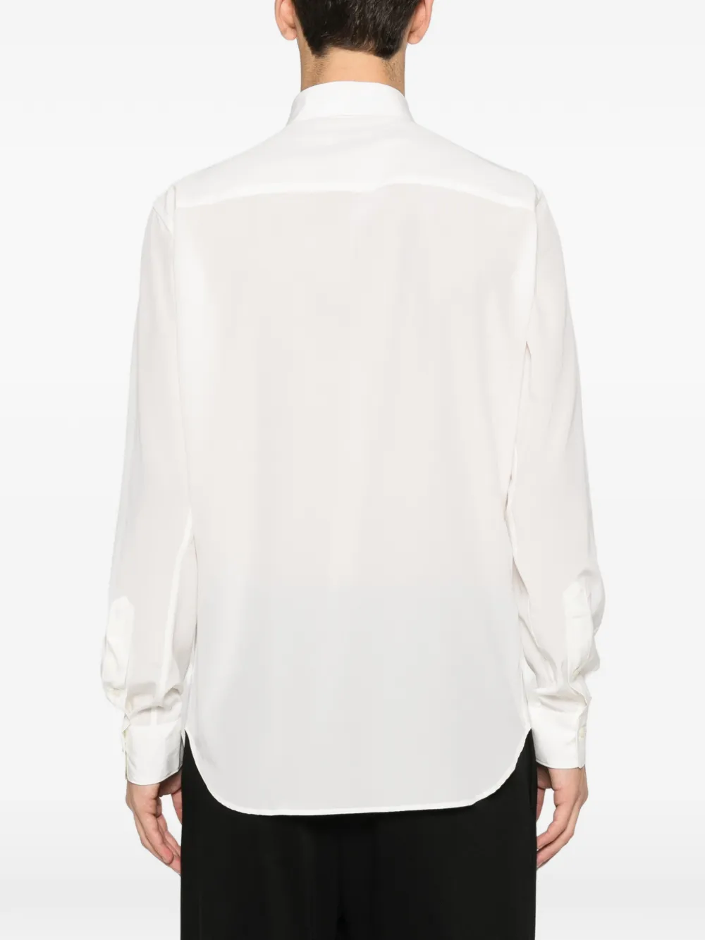 белая рубашка с длинными рукавами, застёжкой на пуговицы, отложным воротником, манжетами на пуговицах и закруглённым подолом