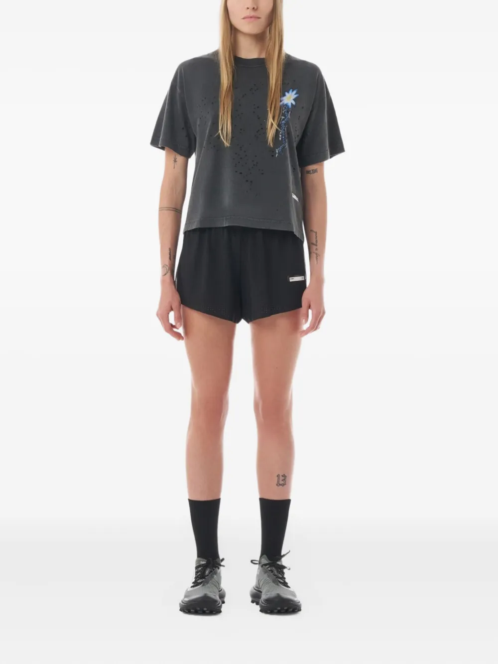 черная футболка с эффектом состаренности, графическим принтом, короткими рукавами, круглым вырезом и нашивкой с логотипом