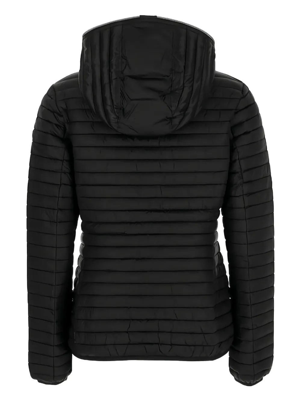 черная куртка с горизонтальной стёжкой, капюшоном и застежкой-молнией