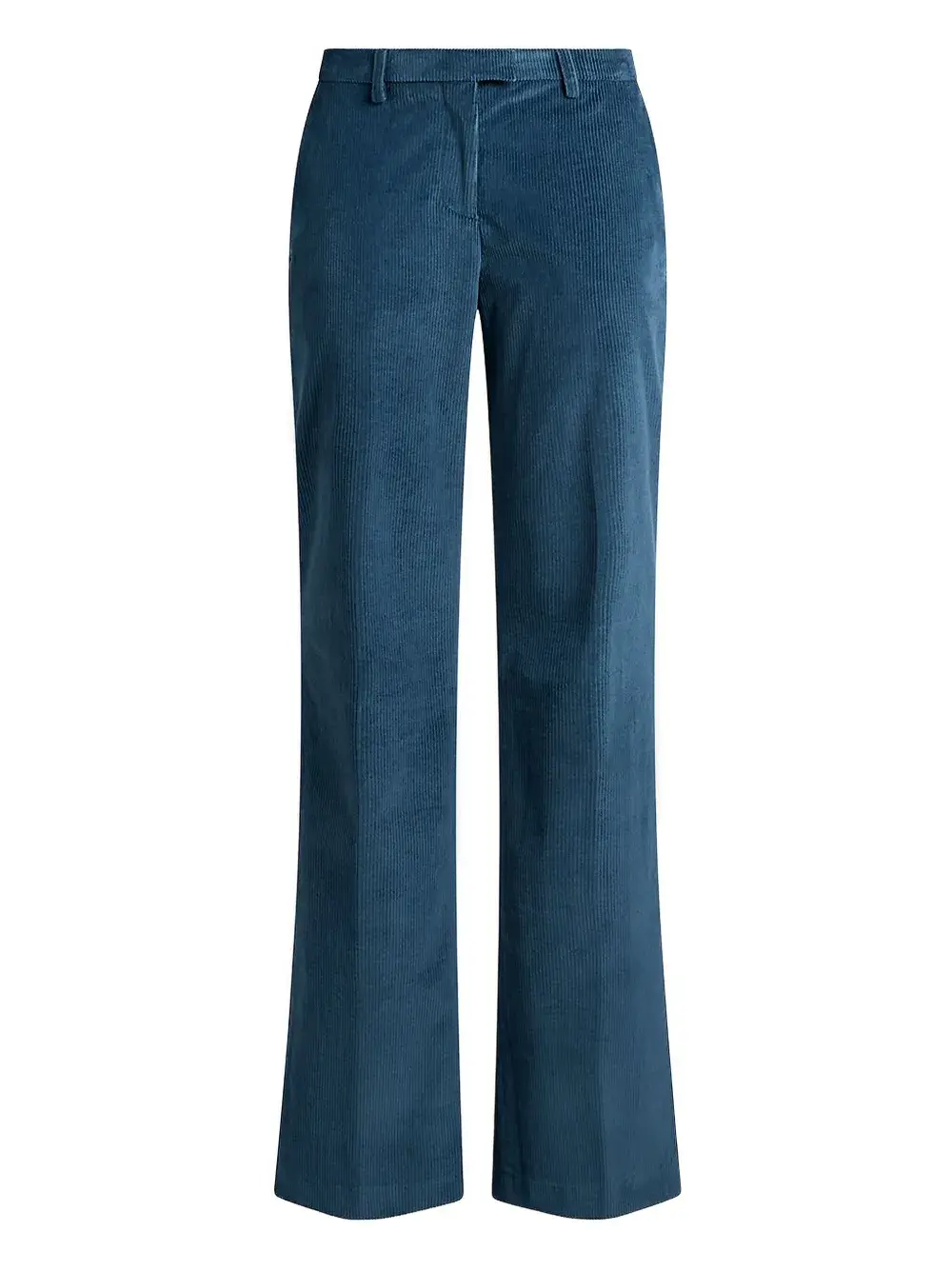 синяя вельветовая фактура, шлевки для ремня, скрытая застежка, задние карманы, тональная строчка