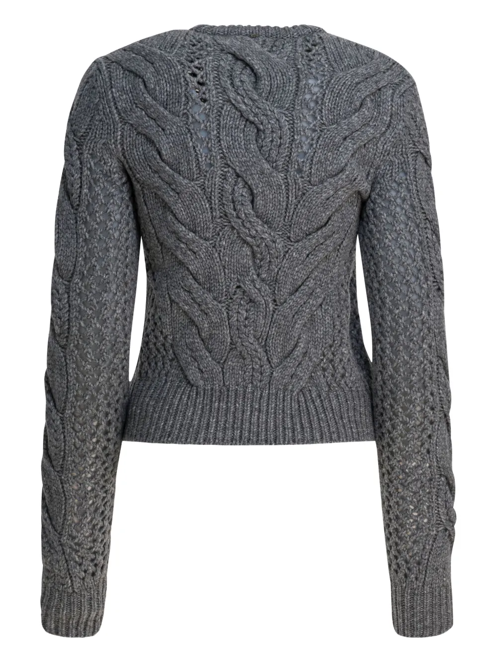 серый вязаный свитер с косами, ребристым подолом, ребристыми манжетами и круглым вырезом