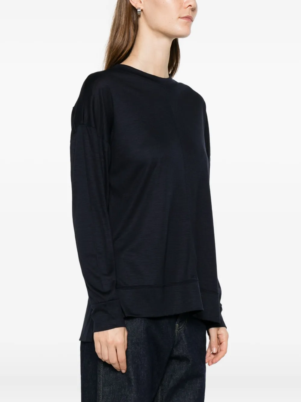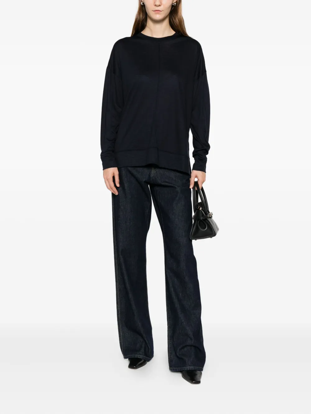 синий джемпер с круглым вырезом, длинными рукавами, комбинированной конструкцией и асимметричным подолом