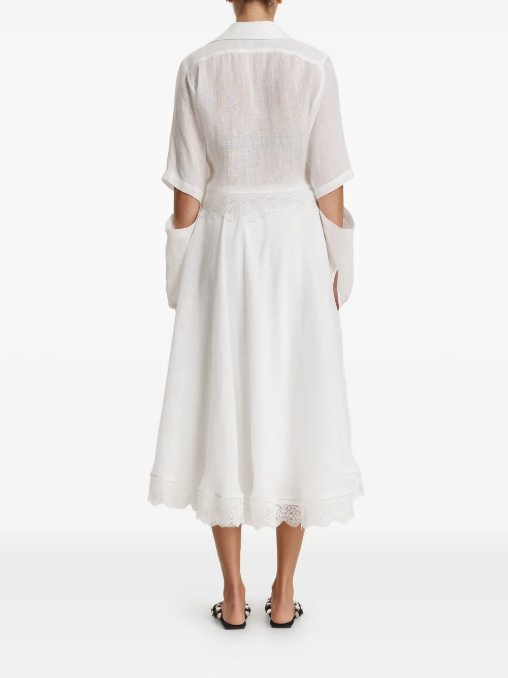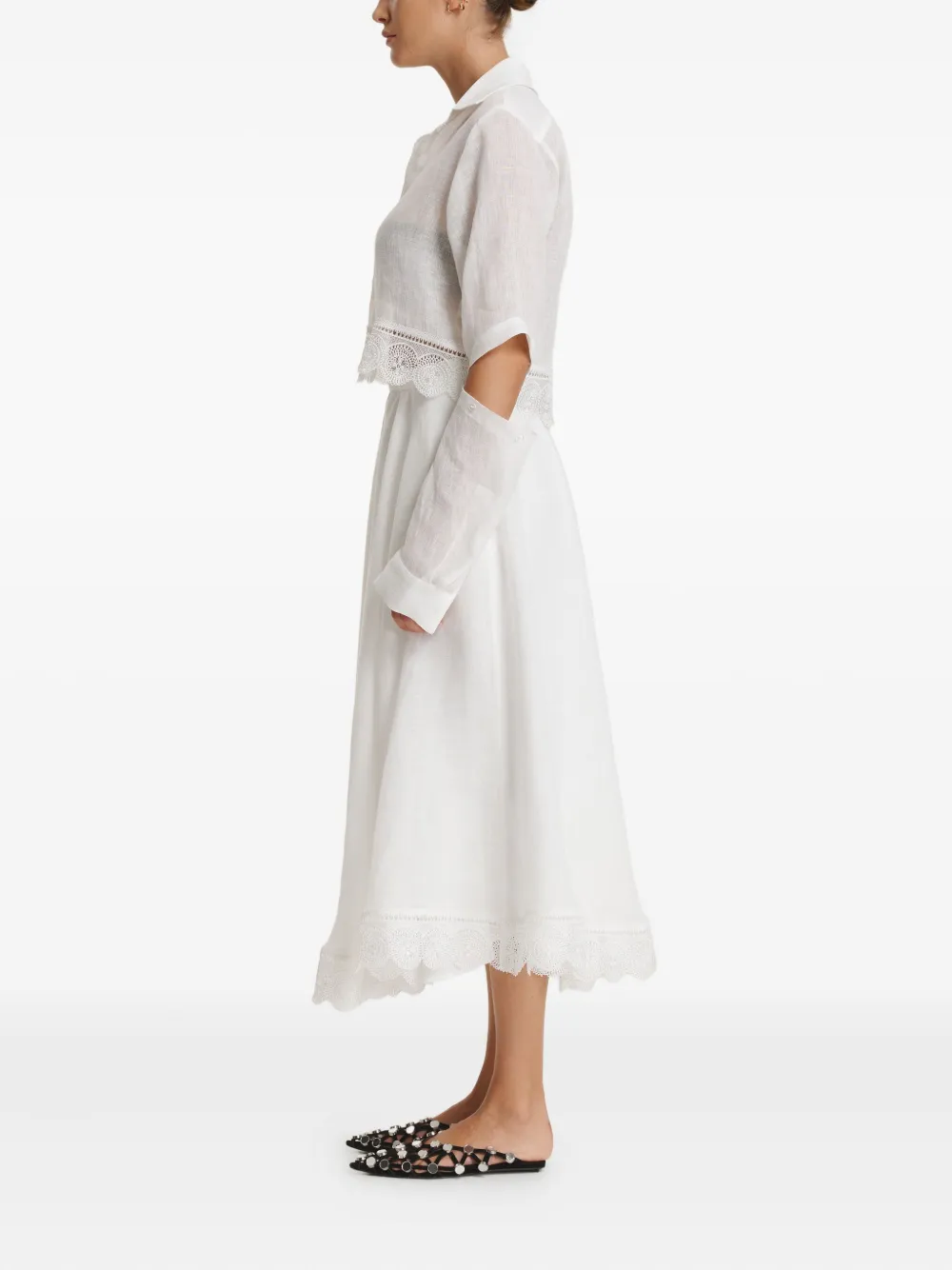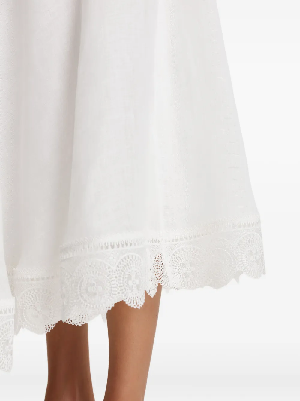 белое льняное миди-платье А-силуэта с завышенной талией и кружевной отделкой