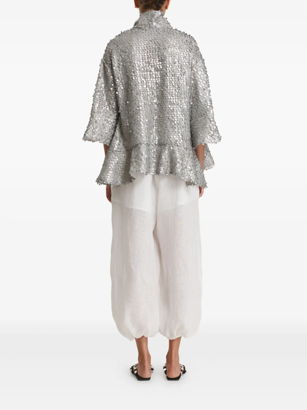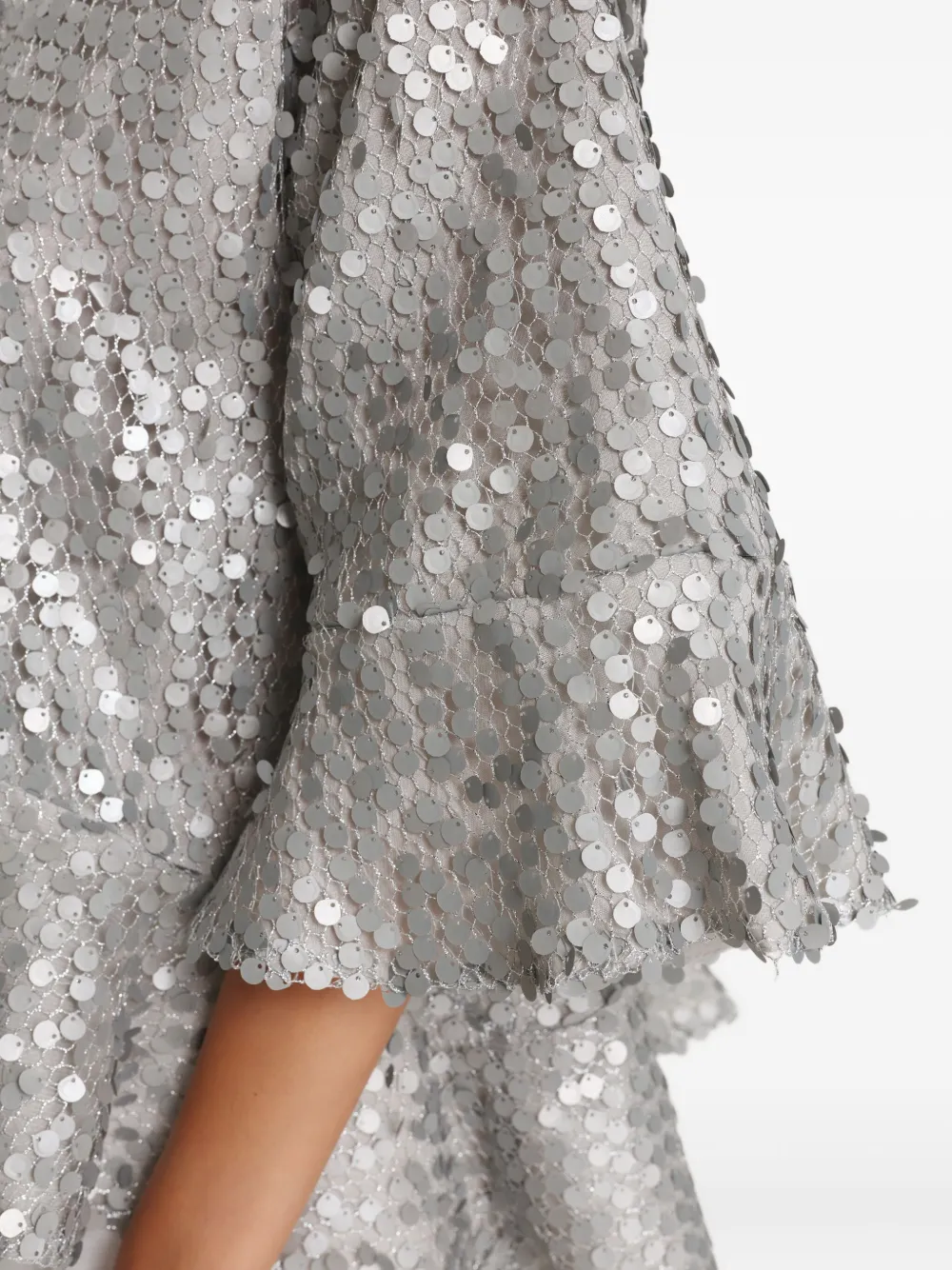 серый топ с украшением пайетками, оборчатым подолом, рукавами три четверти и высоким воротом