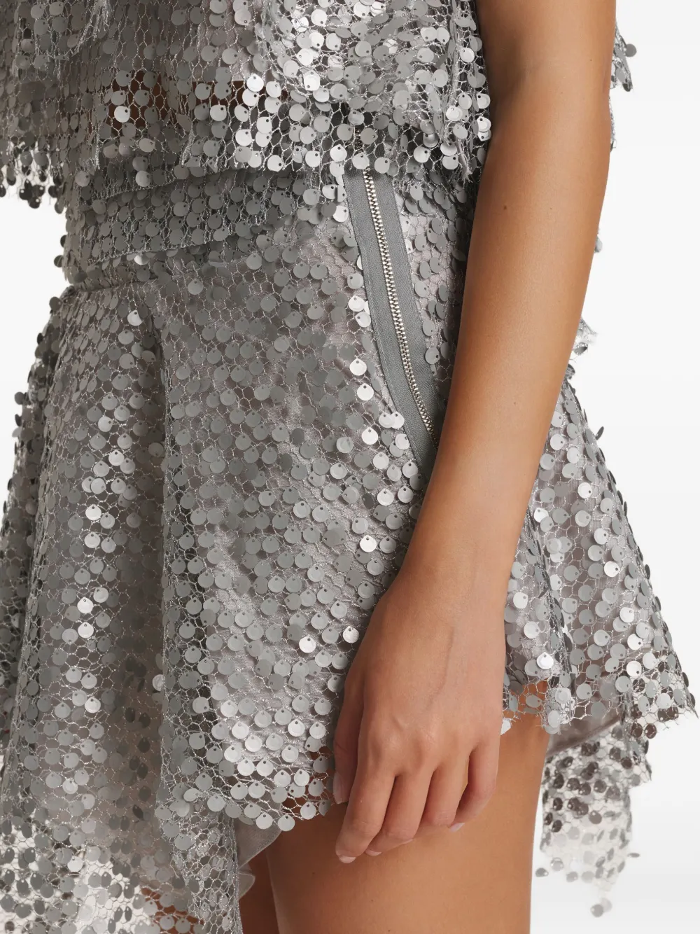 серый топ с отделкой пайетками, молнией и асимметричным подолом