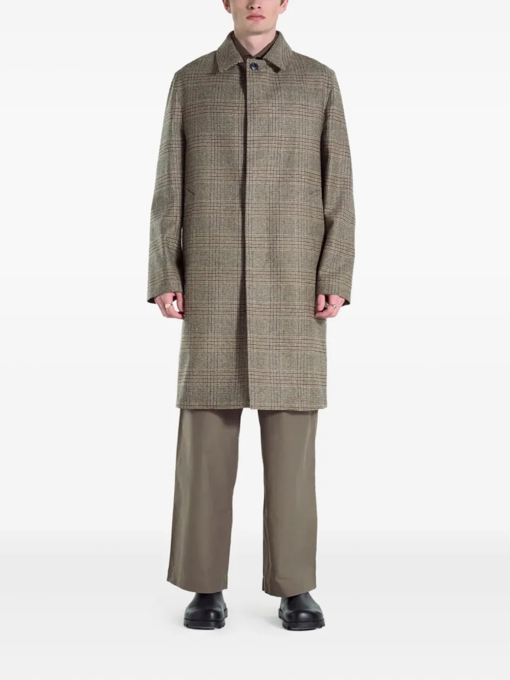 коричневая шерсть, клетчатый узор, застёжка на пуговицы, лацканы с вырезом, накладные карманы спереди, длинные рукава