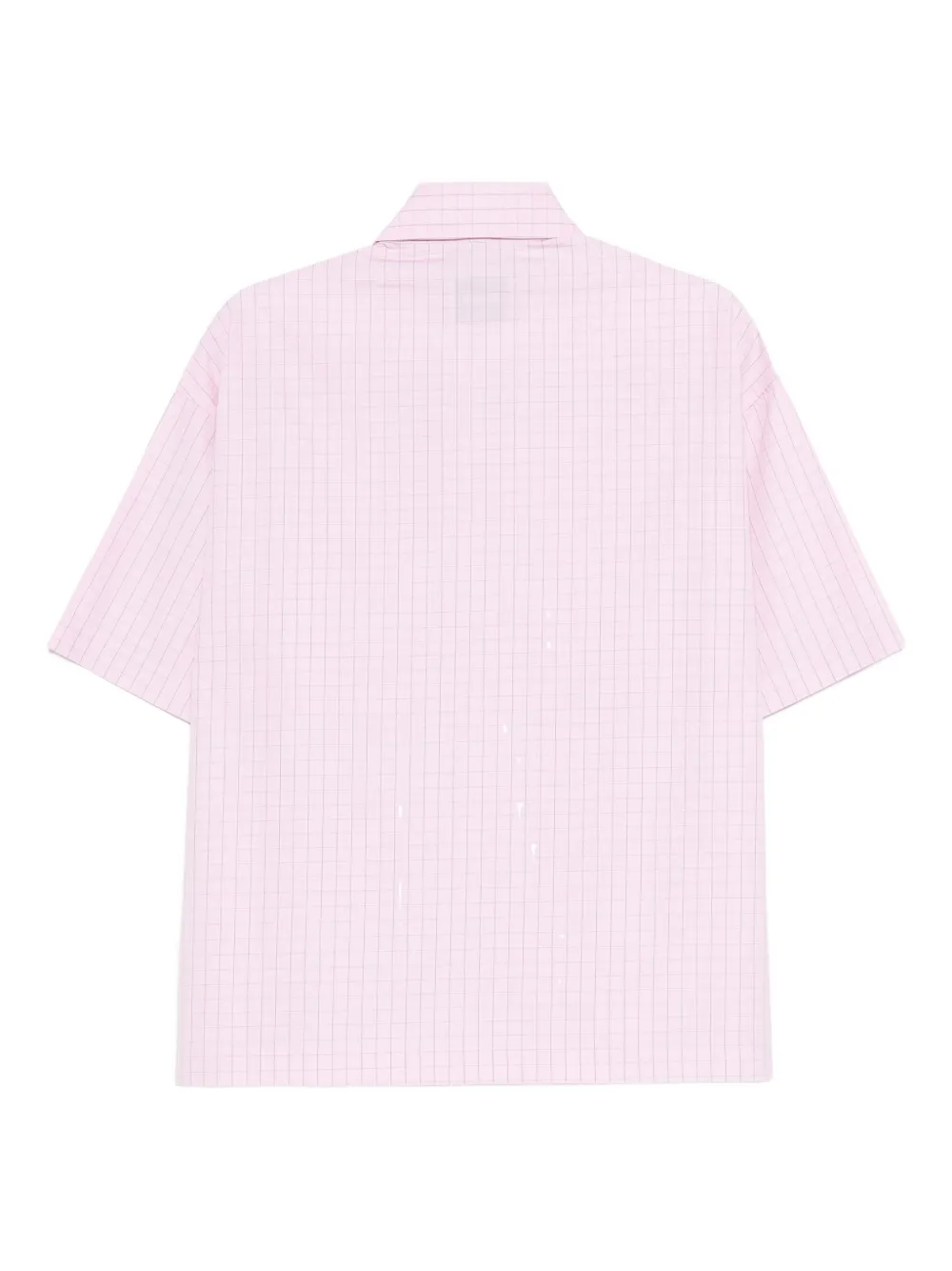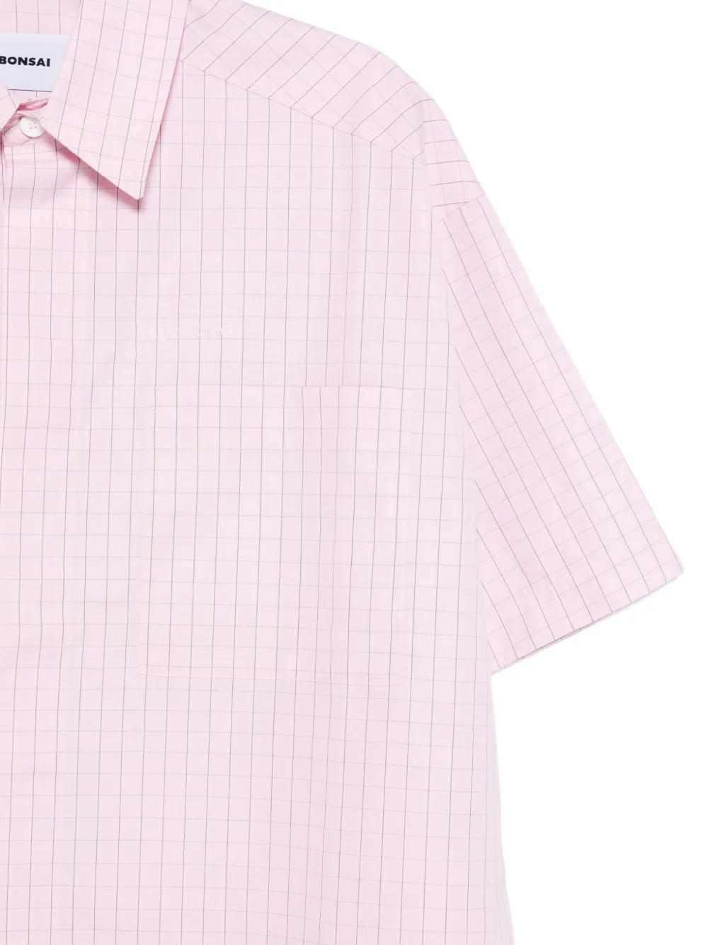 розовая рубашка в клетку с нагрудным карманом, короткими рукавами и отложным воротником