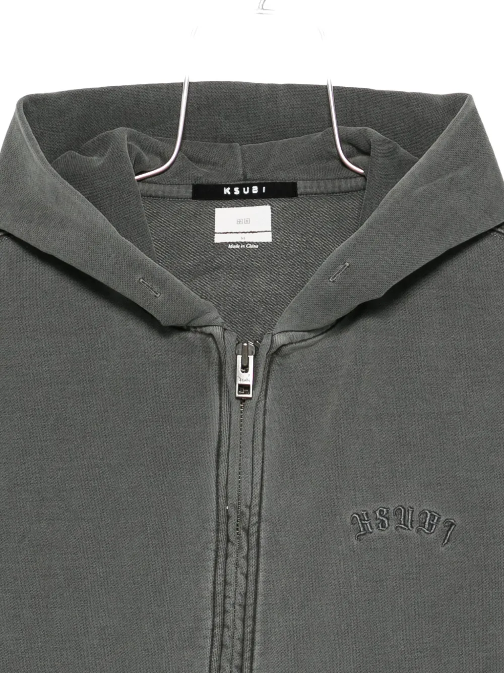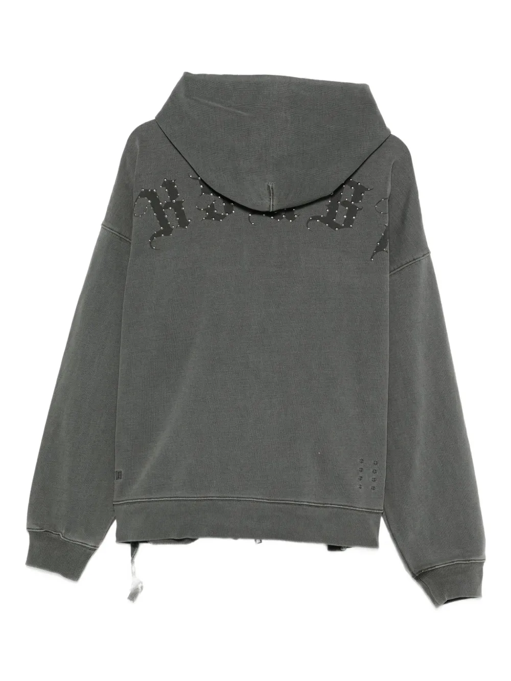 серая худи с капюшоном, двусторонняя застежка-молния, накладные карманы, декор в виде заклепок, ребристые края, логотип