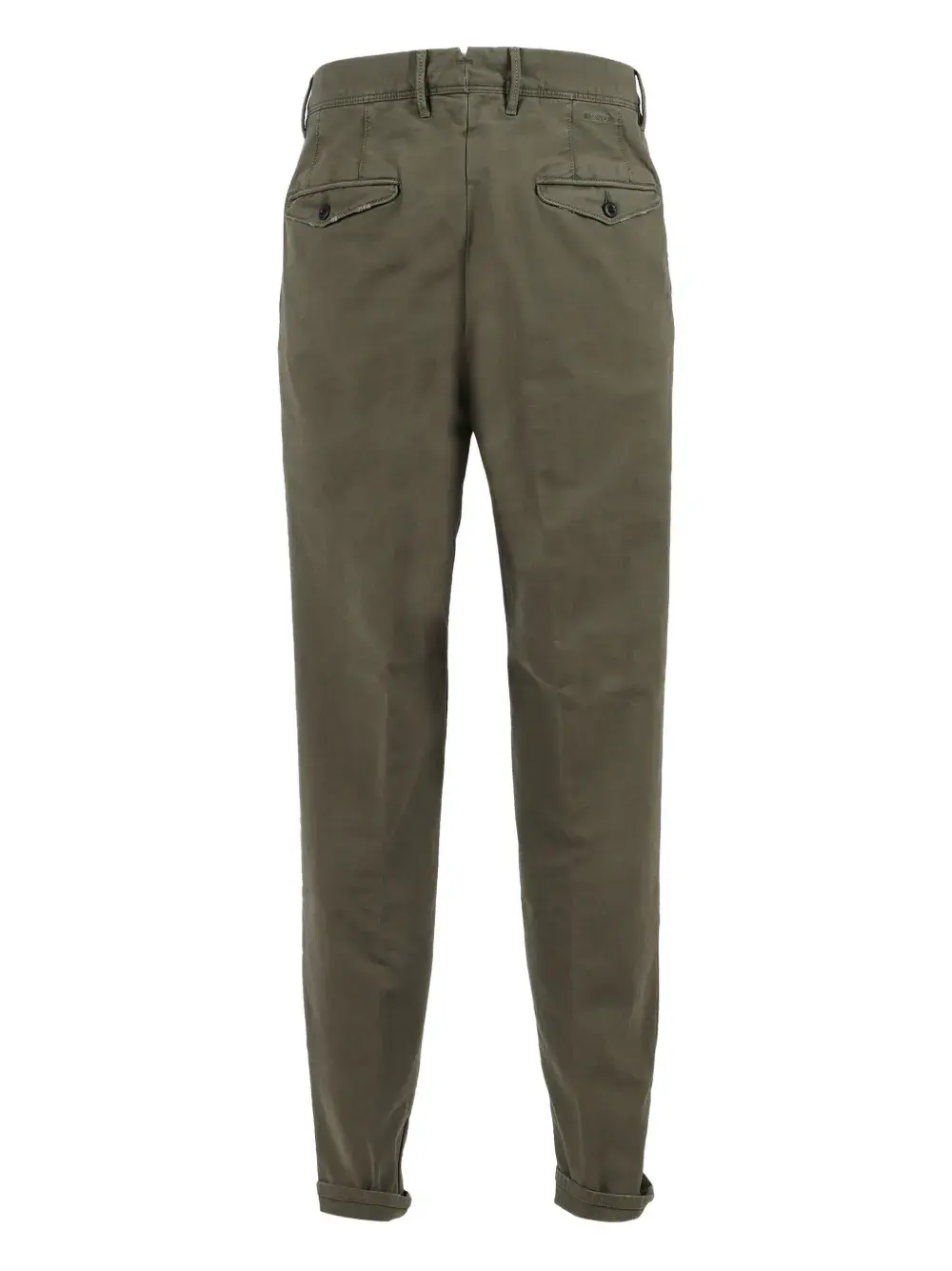 оливкового цвета, шлевки для ремня, застежка на пуговицу, прорезные карманы сзади