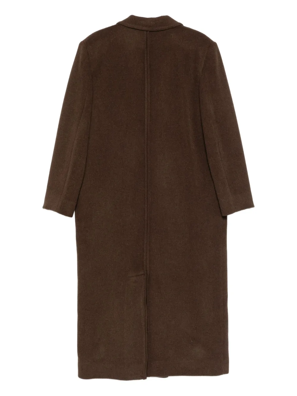 коричневый, застёжка на пуговицы, боковые прорезные карманы, заострённые лацканы, подплечники, центральная шлица сзади, длинные рукава, отделка швами